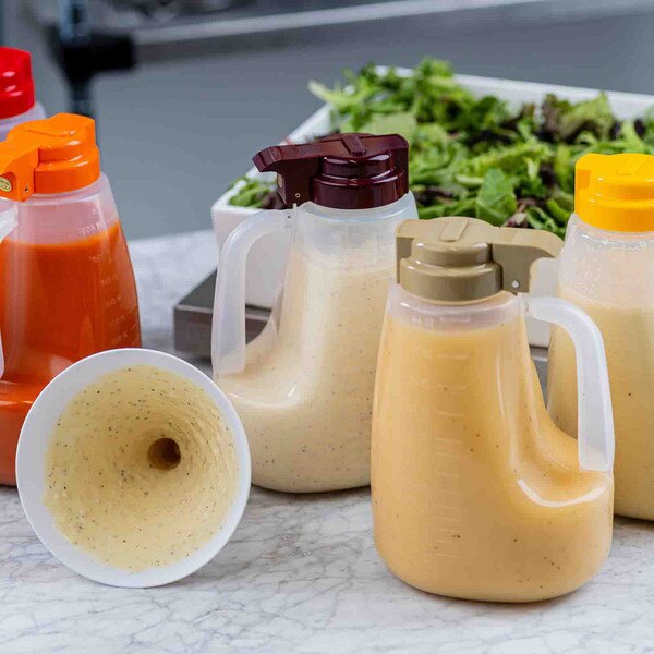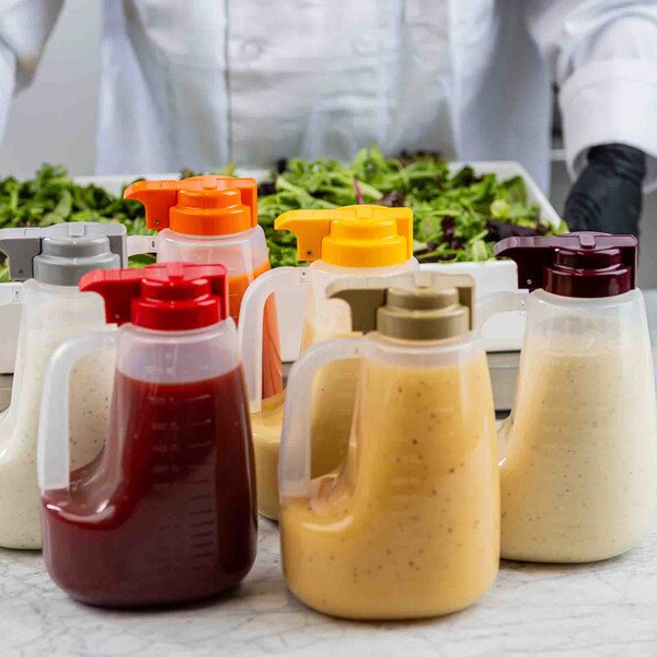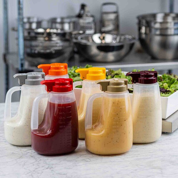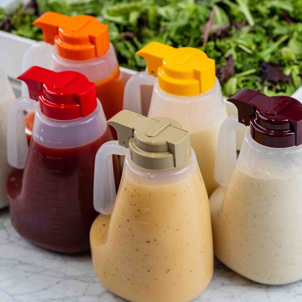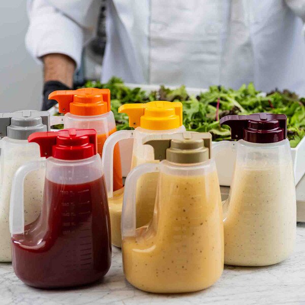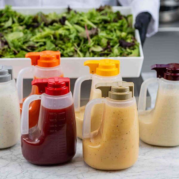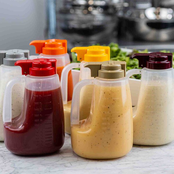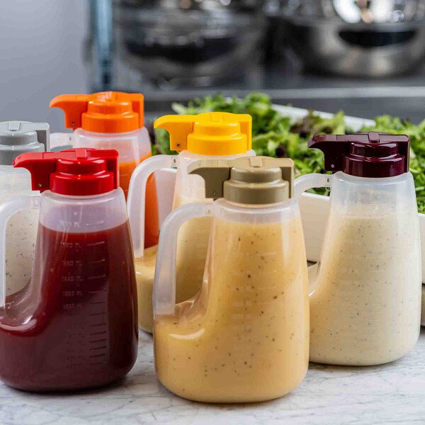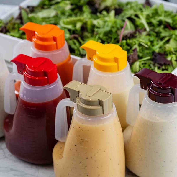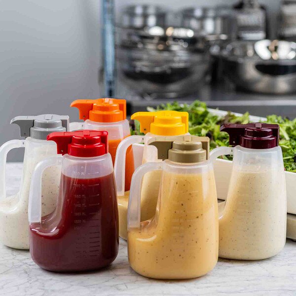 Enhance your buffet line with our convenient, clear salad dressing dispensers. Designed for high-traffic areas, each 1/2 GAL dispenser is crafted from durable polypropylene, built to withstand constant use. The vibrant, colored ABS push-button tops allow for smooth, mess-free pouring, ideal for quick and easy access by guests. This set includes six colors—Gray, Beige, Maroon, Orange, Red, and Yellow—enabling clear identification of different dressings and sauces for an organized, efficient buffet setup. Perfect for self-service stations!