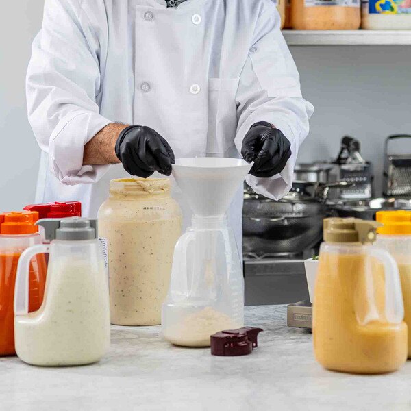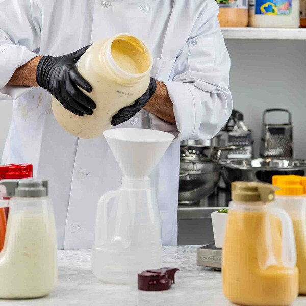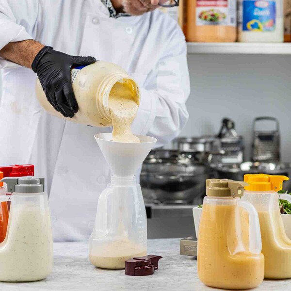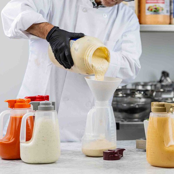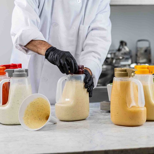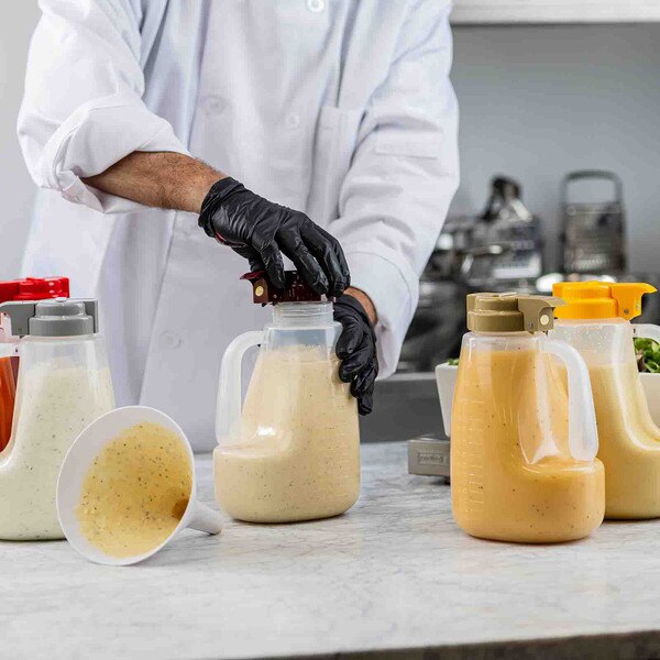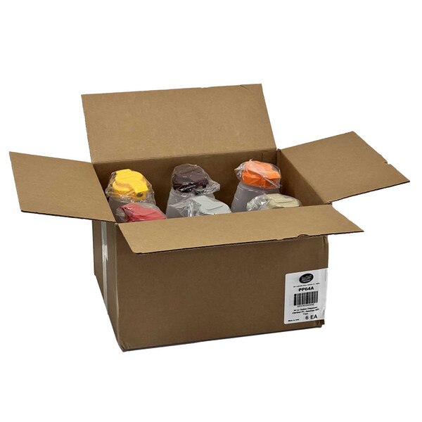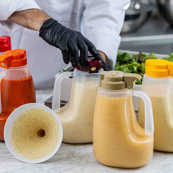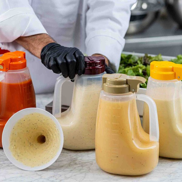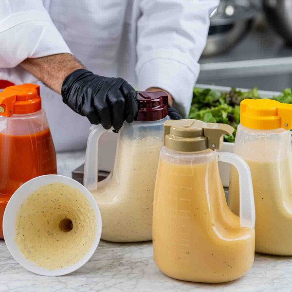 Enhance your buffet line with our convenient, clear salad dressing dispensers. Designed for high-traffic areas, each 1/2 GAL dispenser is crafted from durable polypropylene, built to withstand constant use. The vibrant, colored ABS push-button tops allow for smooth, mess-free pouring, ideal for quick and easy access by guests. This set includes six colors—Gray, Beige, Maroon, Orange, Red, and Yellow—enabling clear identification of different dressings and sauces for an organized, efficient buffet setup. Perfect for self-service stations!