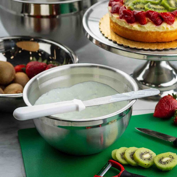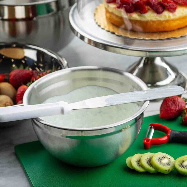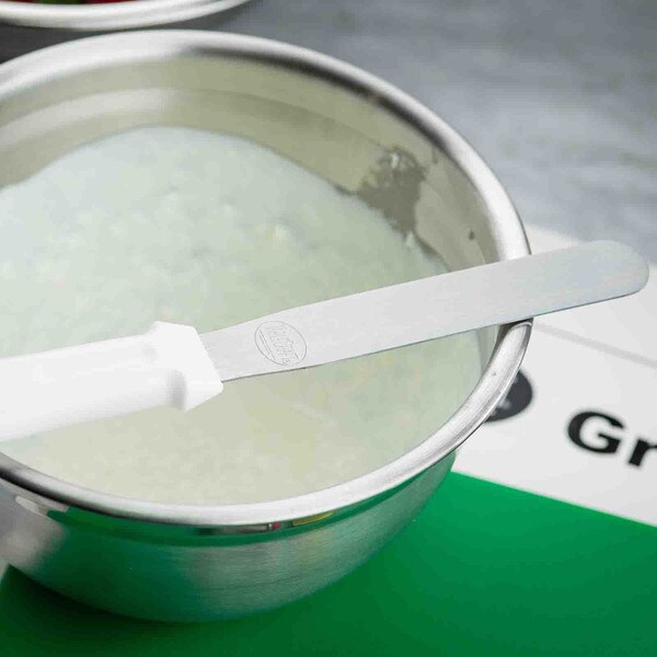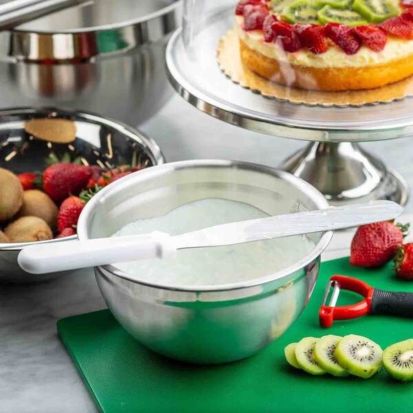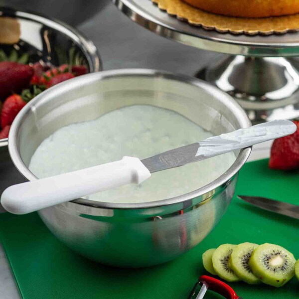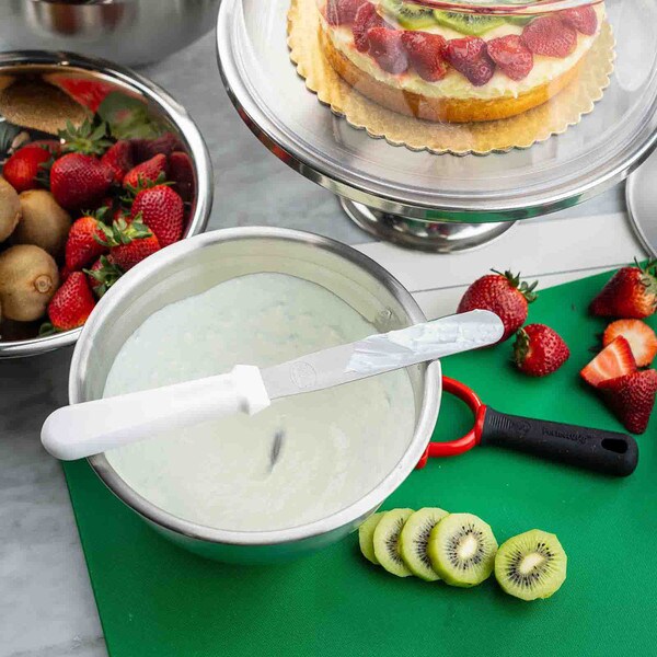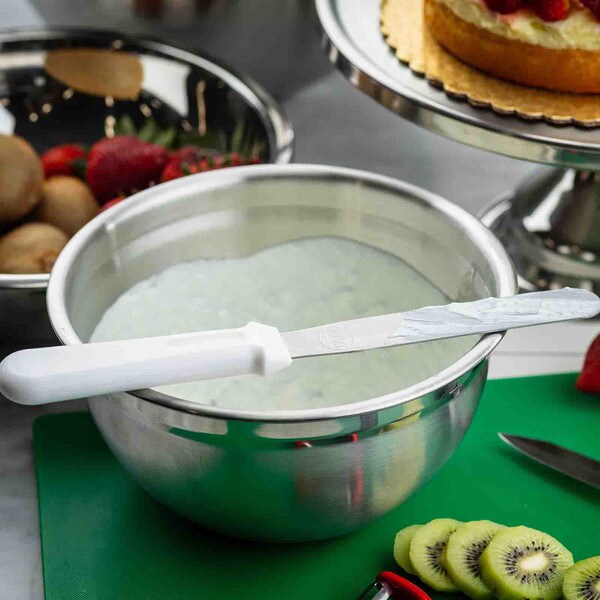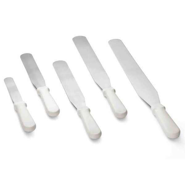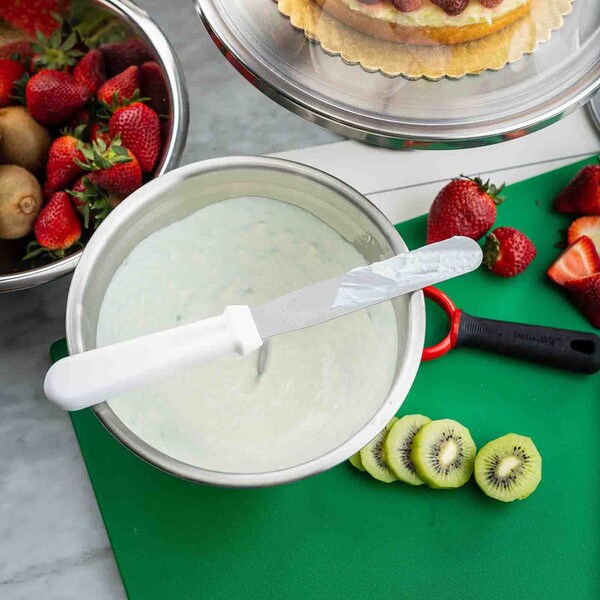 Create the perfect finishing touches as you ice your cakes or start cooking crepes with this 6" icing spatula with an ABS handle. The blade's flat, rounded design, it is perfect to use for smoothing and evenly distributing icing on large, flat surfaces. Additionally, it works well to spread crepe batter.