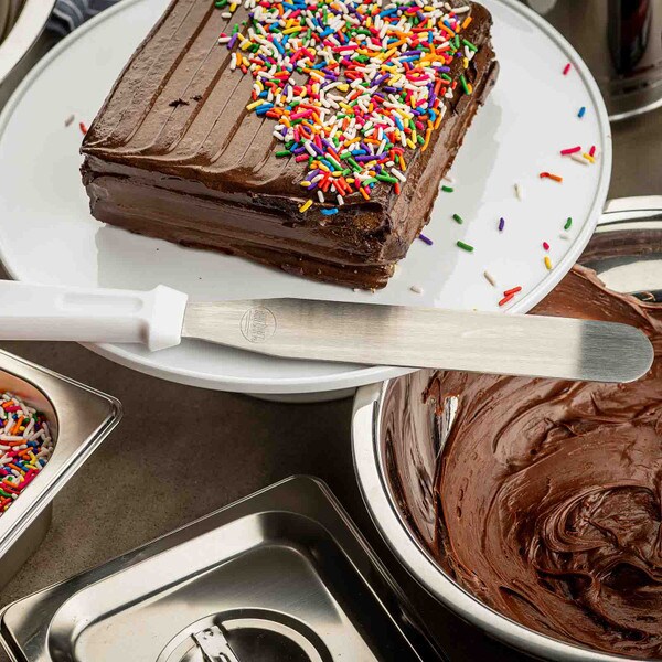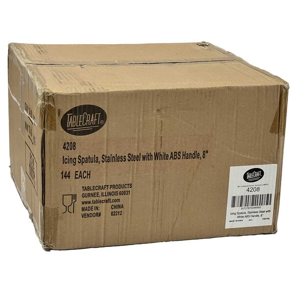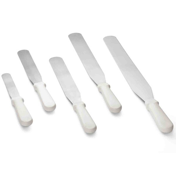 Create the perfect finishing touches as you ice your cakes or start cooking crepes with this 8" icing spatula with an ABS handle. The blade's flat, rounded design, it is perfect to use for smoothing and evenly distributing icing on large, flat surfaces. Additionally, it works well to spread crepe batter.