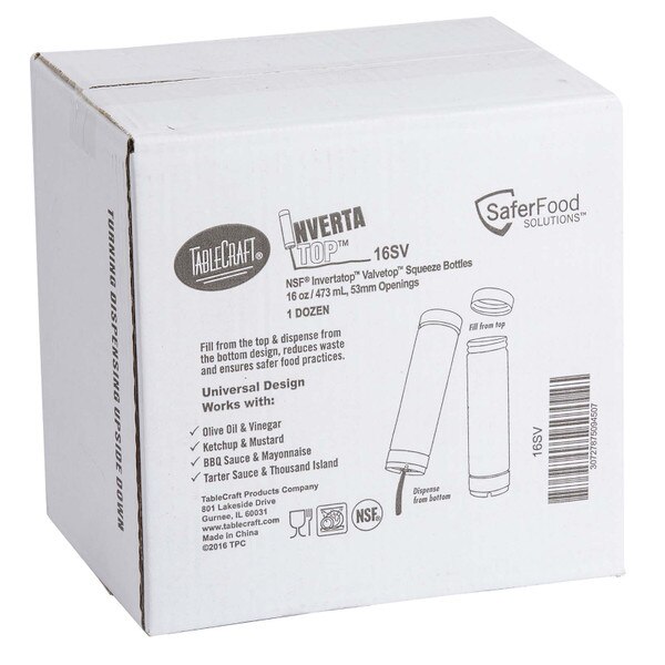 With TableCraft's Invertatop Squeeze Bottles ONE VALVE is all you need to dispense anything from thick relish to thin dressings! Our InvertaTop™ squeeze bottles have an easy-clean, universal ValveTop™ that works with fast-flow AND slow-flow liquids, sauces and condiments. Each bottle fills from the top and dispenses from the bottom, to minimize waste and keep busy food prep areas moving.