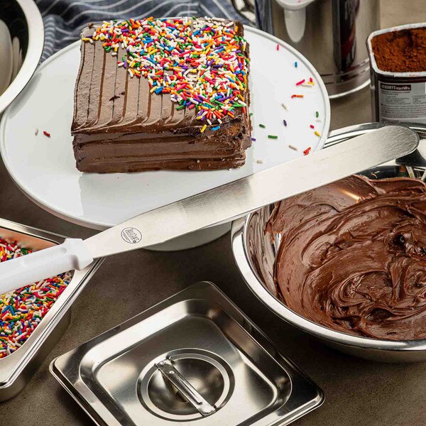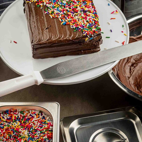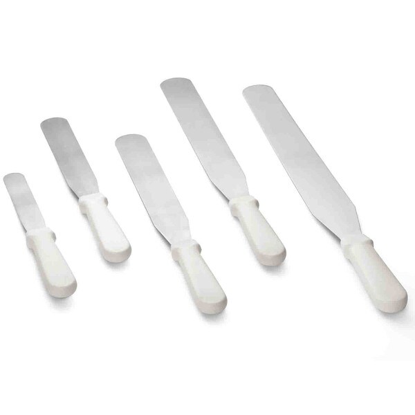 Create the perfect finishing touches as you ice your cakes or start cooking crepes with this 12" icing spatula with an ABS handle. The blade's flat, rounded design, it is perfect to use for smoothing and evenly distributing icing on large, flat surfaces. Additionally, it works well to spread crepe batter.