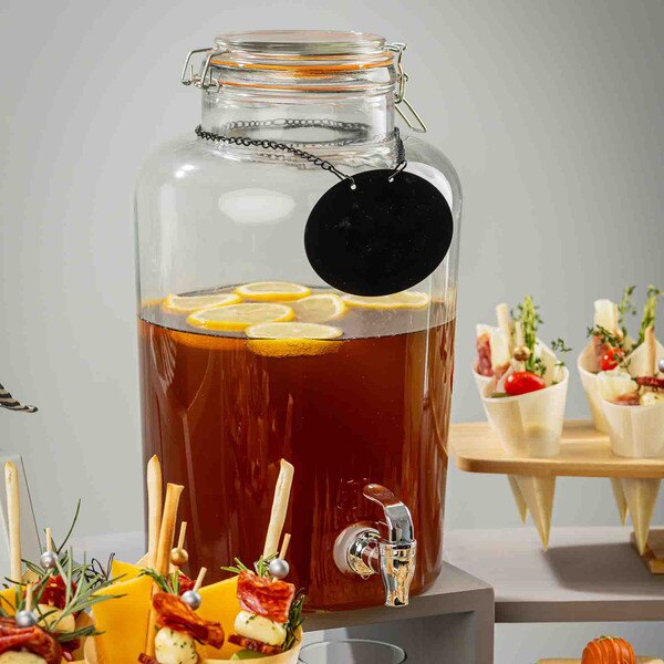 Clear glass beverage dispenser with Rustic Country design. Mix and match with our range of bases to fit the style of your presentation. Ideal for colorful cocktails or drinks with pretty garnishes, it is durable and easy to clean (hand wash only), this cocktail dispenser can be used for every type of party or event, and is suitable for indoor and outdoor use. This 2½ Gal dispenser brings character and charm to your drink station. Includes a chrome plated faucet and a chalkboard necklace for labeling your drinks.