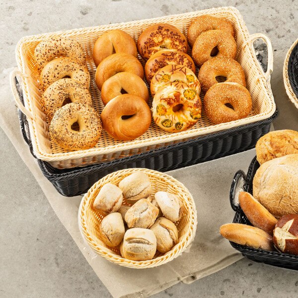 Bring that homemade rattan look to your tabletop and buffet service with our Handwoven Natural Baskets. The Polypropylene construction offers superior quality and durability for daily use. Serve freshly-baked bread, rolls, muffins and just about any other shareable item. Or create a silverware caddy, condiment organization, grab-and-go snacks and more. The uses for these sturdy rattan-weave baskets are limitless.
