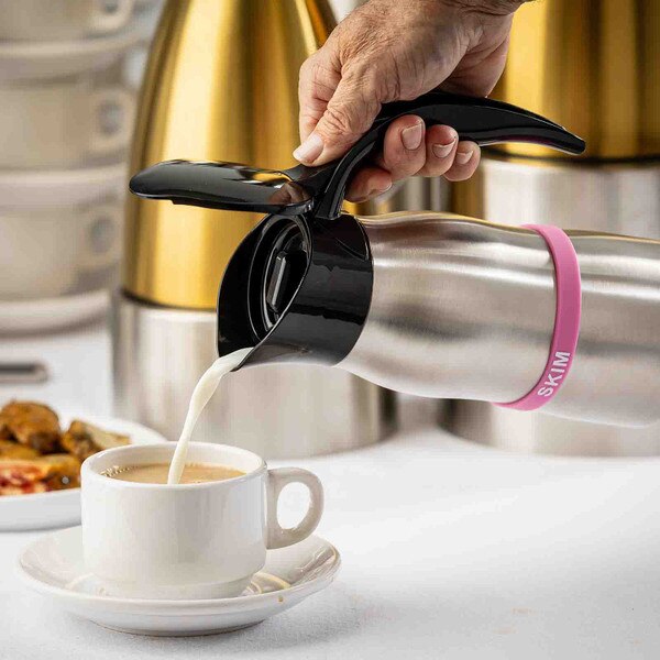 Serve creamers and milk alternatives in style with this sleek, double-wall stainless steel carafe. Vacuum insulated to keep contents cold for up to 3 hours, it’s the perfect choice for breakfast buffets, coffee stations, or self-serve beverage bars. Whether you’re offering dairy, plant-based options, or flavored creamers, this carafe delivers a polished presentation and reliable performance. The flip-top lid and comfortable handle ensure easy filling and smooth, controlled pouring—ideal for fast-paced foodservice setups.