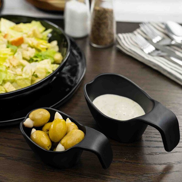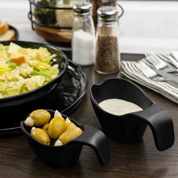 Introducing our Black Melamine Sauce Boats, designed to enhance your serving experience. These versatile boats are ideal for portioning and serving sauces, gravies, dressings, as well as fries and single-serve appetizers. Each boat features angled handles for easy pouring and comfortable handling. Additionally, their stackable design makes for convenient and efficient storage, helping you keep your serving supplies organized. Perfect for both casual and formal dining, these sauce boats combine practicality with style.