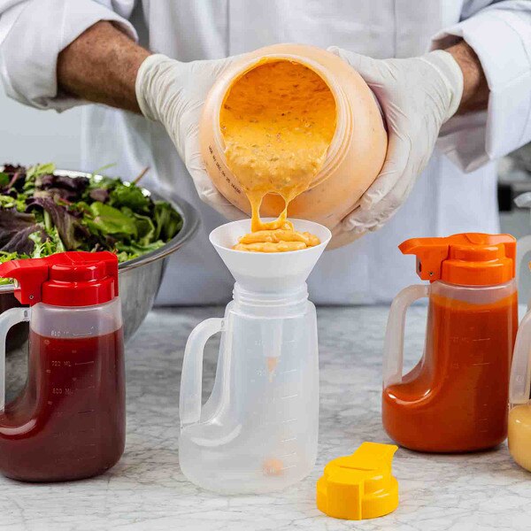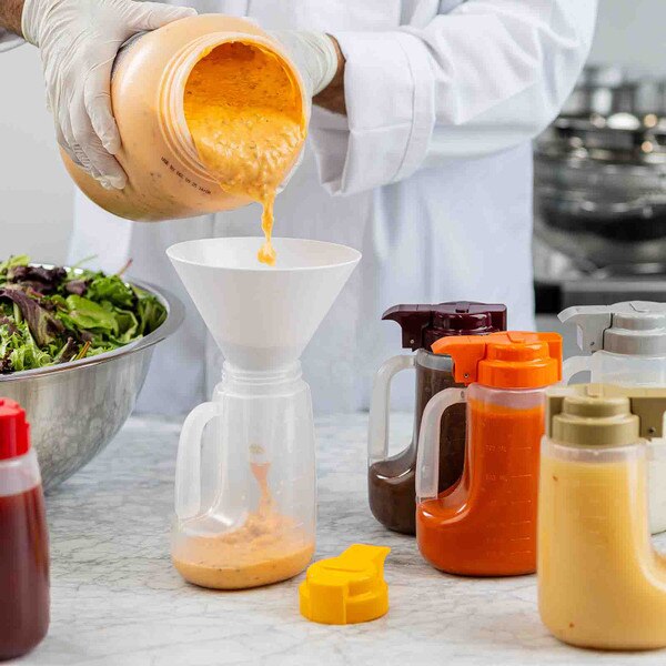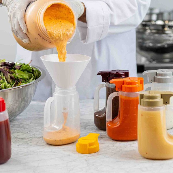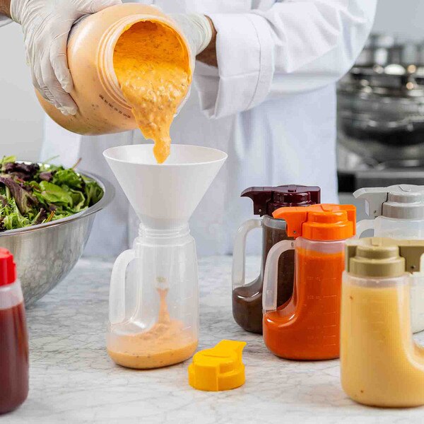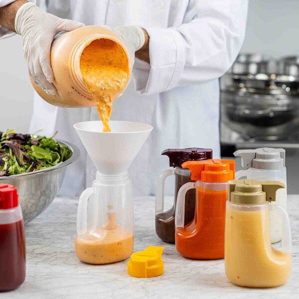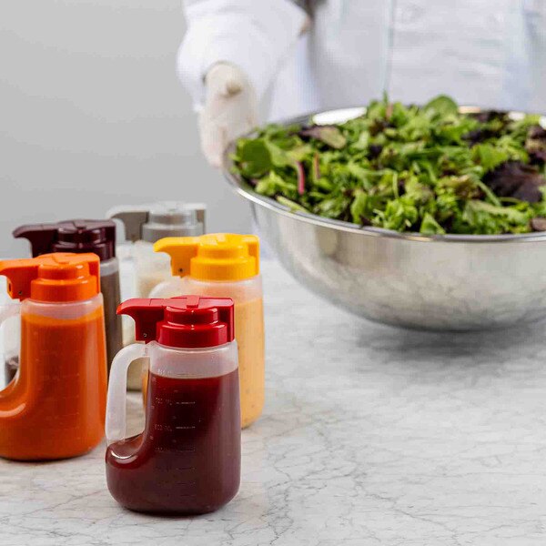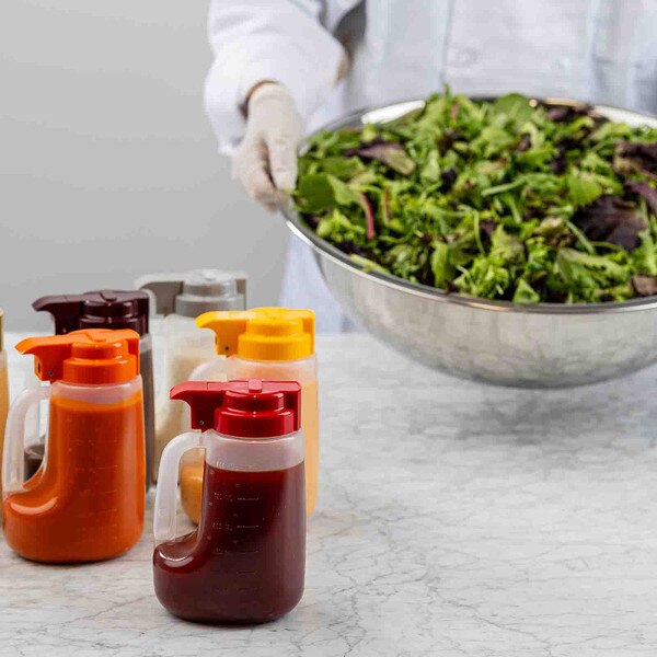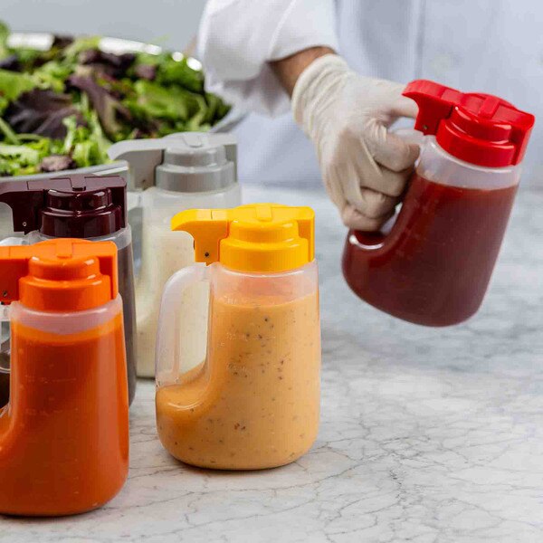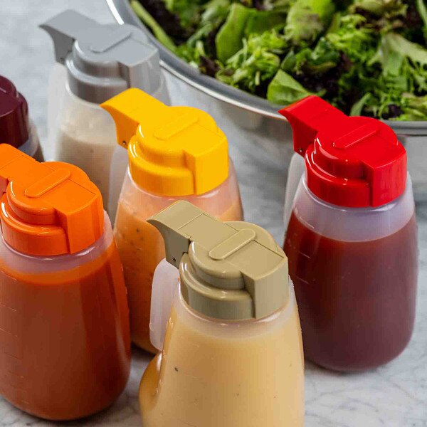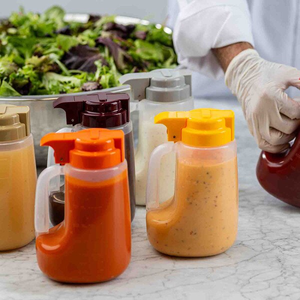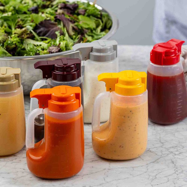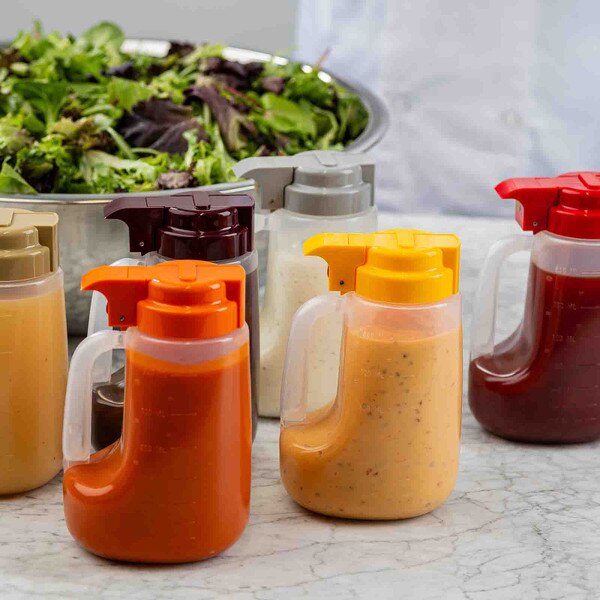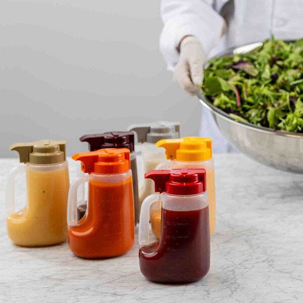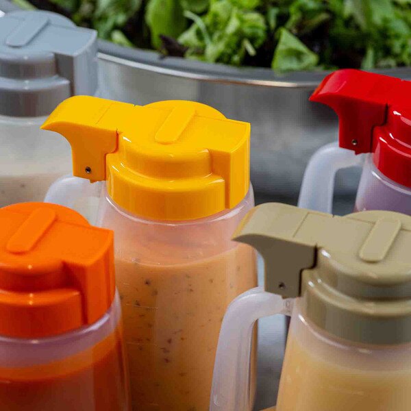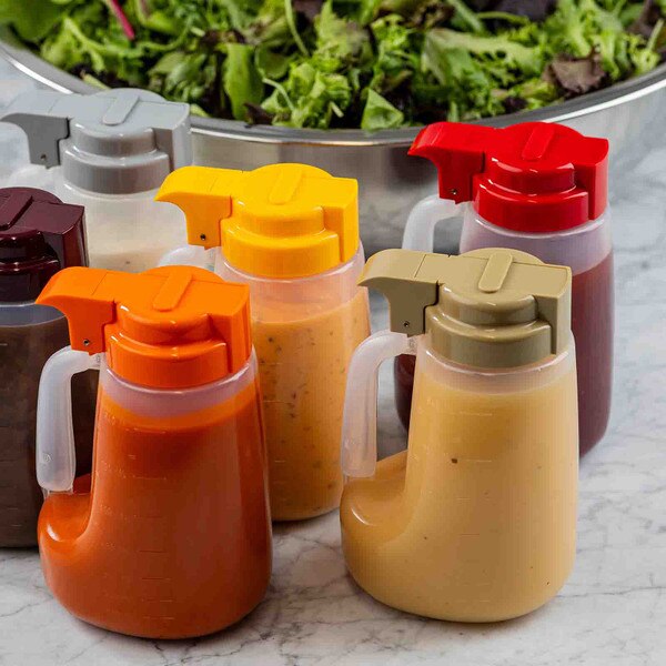 Enhance your buffet line with our convenient, clear salad dressing dispensers. Designed for high-traffic areas, each 32 oz dispenser is crafted from durable polypropylene, built to withstand constant use. The vibrant, colored ABS push-button tops allow for smooth, mess-free pouring, ideal for quick and easy access by guests. This set includes six colors—Gray, Beige, Maroon, Orange, Red, and Yellow—enabling clear identification of different dressings and sauces for an organized, efficient buffet setup. Perfect for self-service stations!