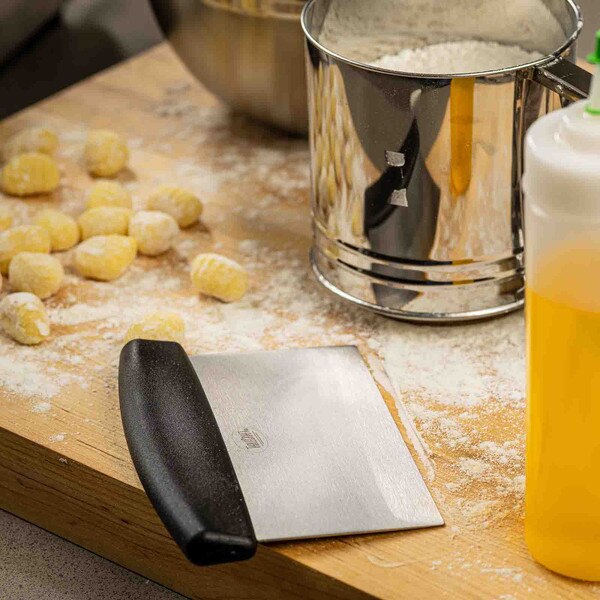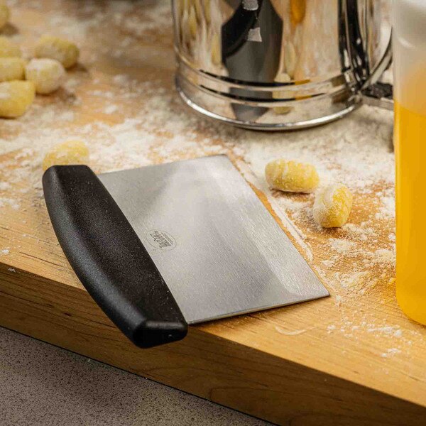 Designed to simplify food preparation, this stainless steel dough cutter / bench scraper is a must-have tool in any kitchen! Not only can it slice through dough to portion rolls or pizza bases, but it helps scrape up leftover dough at the end of prep and move chopped veggies to the pan with ease. Black polypropylene handle provides a comfortable, sturdy grip.
