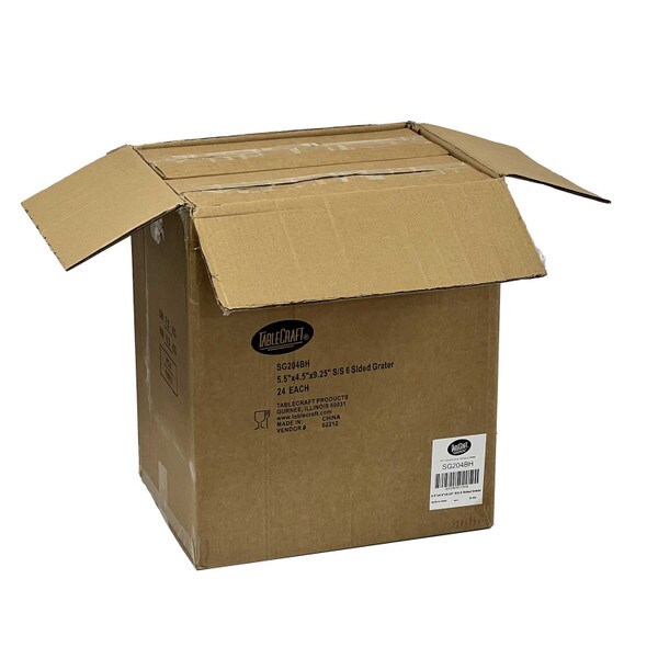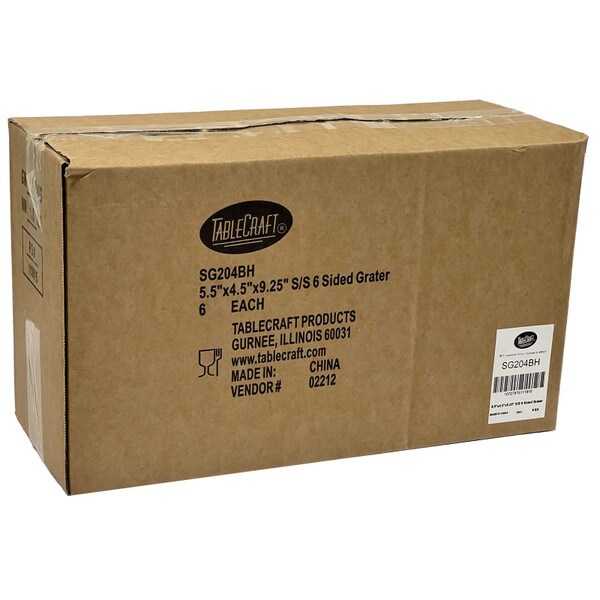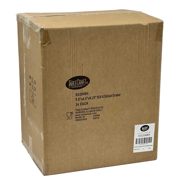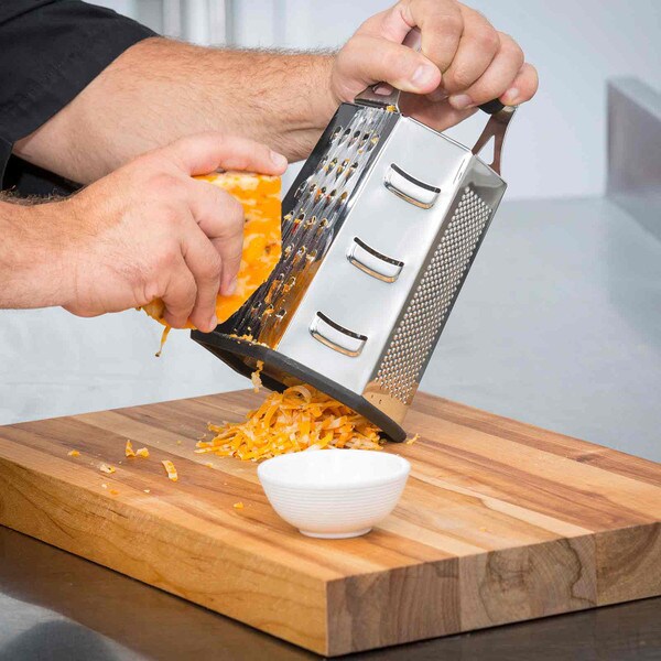Tackle a variety of prep tasks with this 6-sided tapered grater, designed for versatility and efficiency in professional kitchens. Each side offers a different function -- fine grating, coarse grating, slicing, zesting, ribbon slicing, and corrugated slicing -- making it the perfect all-in-one tool for cheese, vegetables, citrus, and more. A sturdy top handle provides a secure grip for stability during use, while the durable stainless steel construction withstands heavy-duty, daily foodservice demands and the rubber bottom keeps it in place. Compact and efficient, this grater is an essential tool for restaurants, catering, and high-volume kitchens.