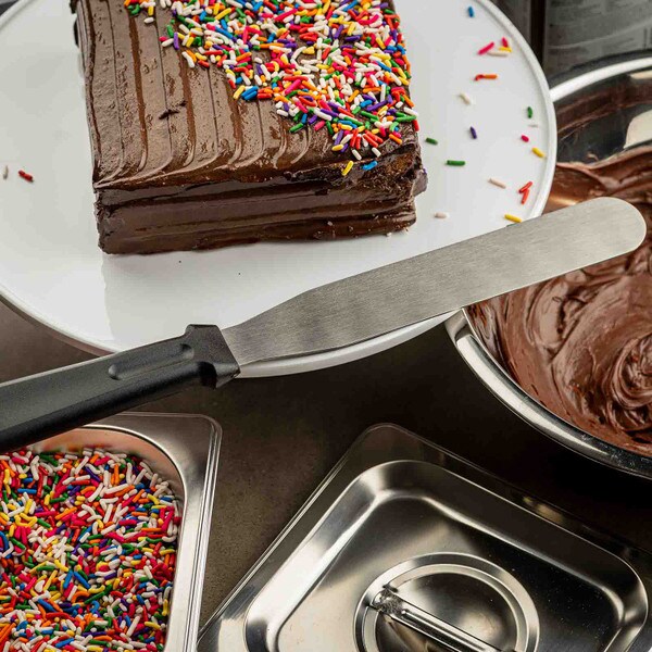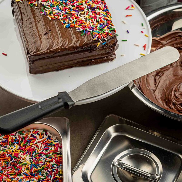Achieve flawless finishing touches with this 8" icing spatula, designed for professional bakers, pastry chefs, and cooks. Featuring a durable ABS handle for a comfortable grip, this spatula ensures smooth, even application every time. The flat, rounded stainless steel blade glides effortlessly across large cakes, pastries, and delicate crepes, making it perfect for spreading icing, leveling batters, and evenly distributing crepe batter for consistent results. Whether you're decorating a multi-tiered cake or perfecting your breakfast spread, this spatula is a must-have tool!