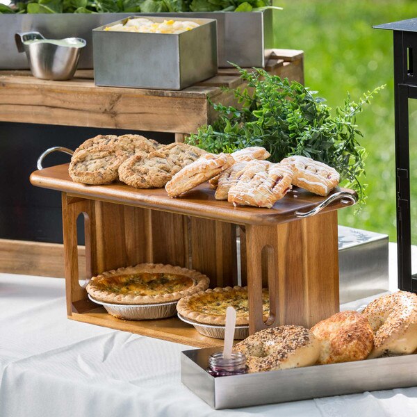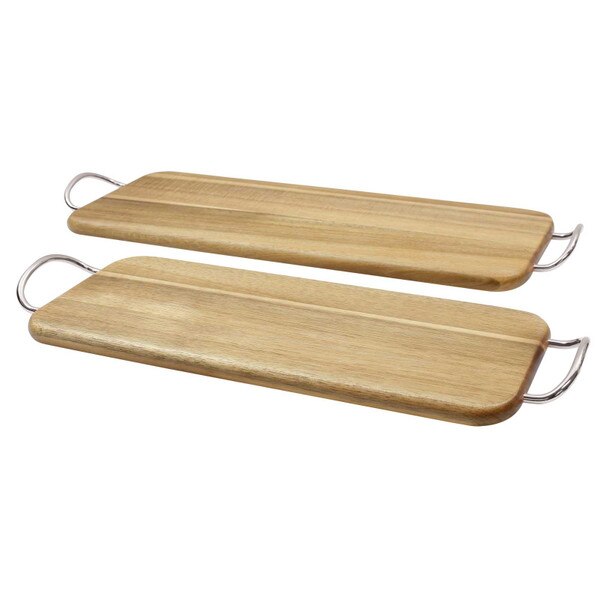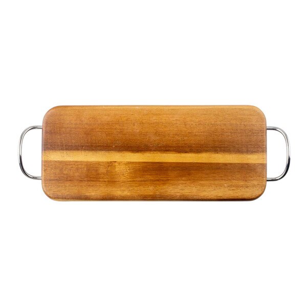 Bring rustic charm and warmth to your table setting with these handcrafted wooden serving pieces. This rectangular serving board features nickel-plated handles on both ends that make transport from kitchen to table a breeze. Can also be used to hang for storage or decor. This Acacia wood board is ideal for bread service, sides, entrees and more.