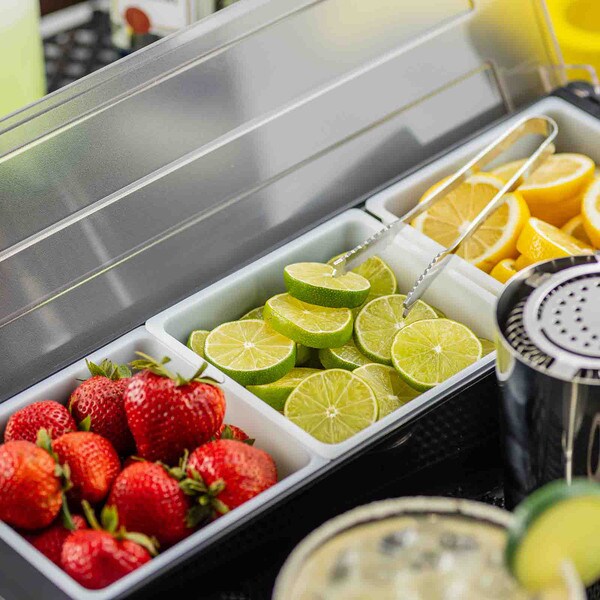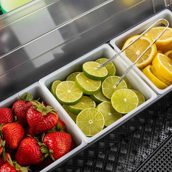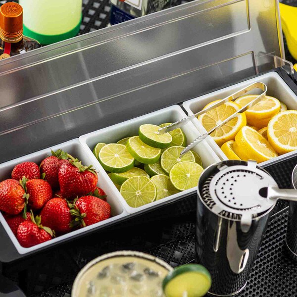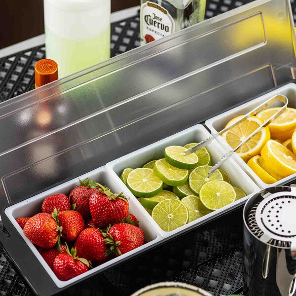 This 6 compartment condiment holder is a great serving solution for catering operations, and essential to hotel and restaurant bar service stations. Featuring a translucent plastic hinged lid, this condiment holder not only allows partial visibility to see when garnishes need to be refilled but also will preserve the quality of your fresh garnishes, from cherries and olives to limes, lemons, and oranges. Plus, the lid provides protection from contaminants when not in use. The condiment holder has a 3 qt. total capacity. It includes three 1 quart, hard plastic inserts which separate your garnishes to prevent cross-contamination.