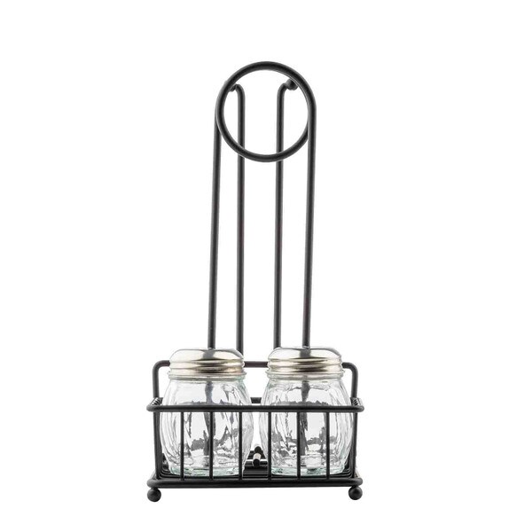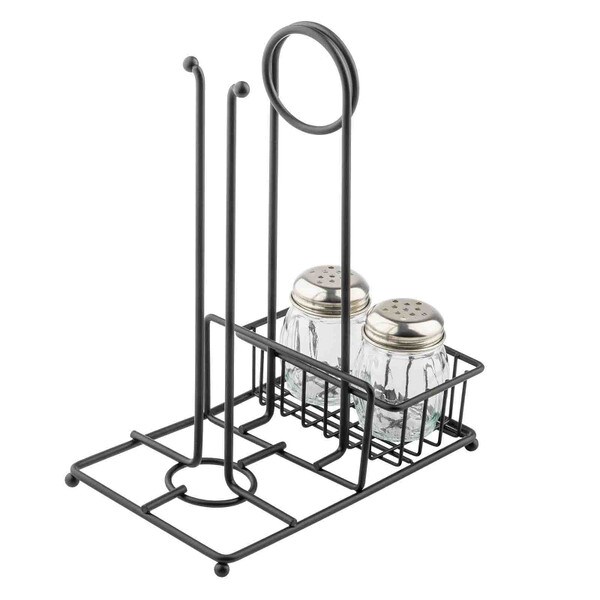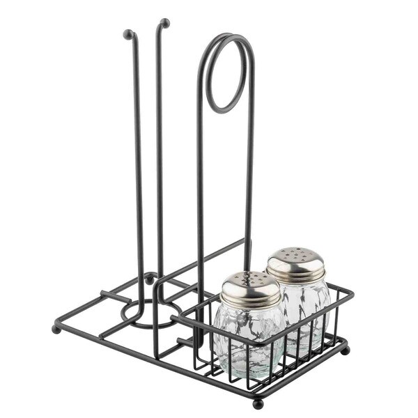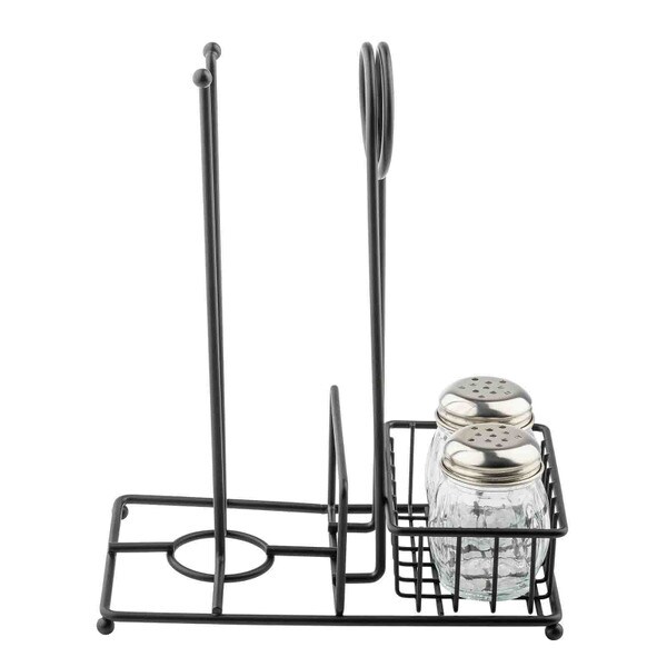 Talk about a multi-use tabletop solution! Our matte black caddy does it all! It holds a roll of paper towels, and two bottles/shakers. Plus, a merchandising ring offers a spot to display menus, specials and other marketing flyers. Ideal for BBQ restaurants, fact-casual spots and more.