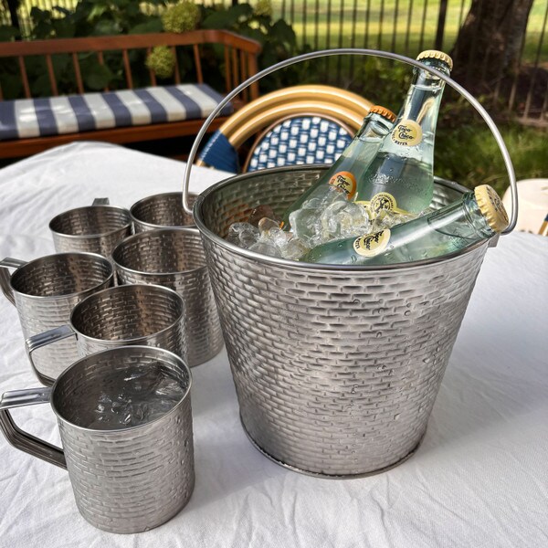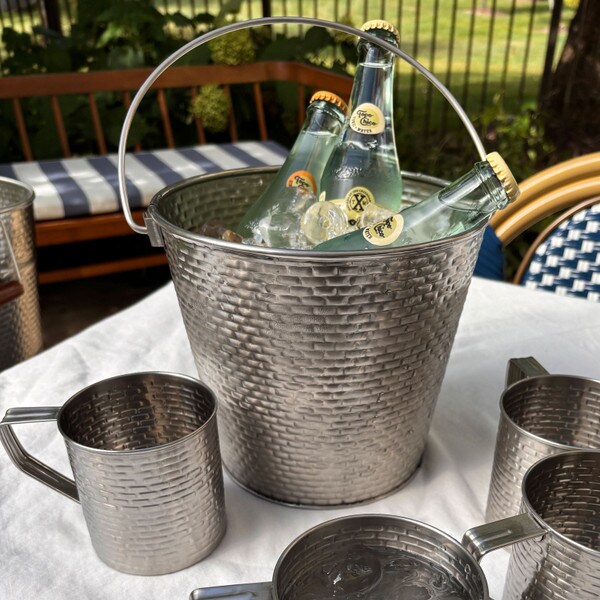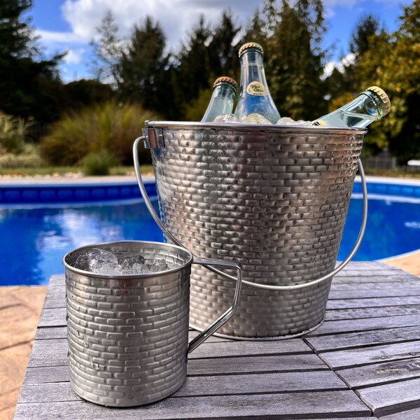 This stylish large Stainless Steel Brickhouse Collection Pail, adorned with a fun brick motif, is your go-to for keeping beverages chilled—whether you're indoors or soaking up the sun on the patio. But wait, there’s more! Flip it upside-down, and voila! It transforms into a chic riser for your platters and beverage dispensers, adding a playful touch and height to your table spread. With this versatile piece, you can mix functionality with flair, making every meal a festive occasion!