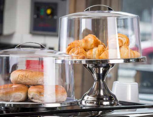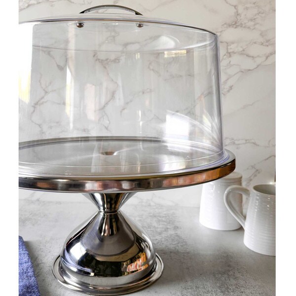 Show off the quality and freshness of your playfully decorated cakes, pies, cupcakes, and muffins with this attractive stainless steel cake stand. The eye catching, non-revolving cake stand provides excellent product visibility, and is ideal for diners, bakeries, family restaurants, or any location that sells baked goods. Set includes cake stand and cover.
