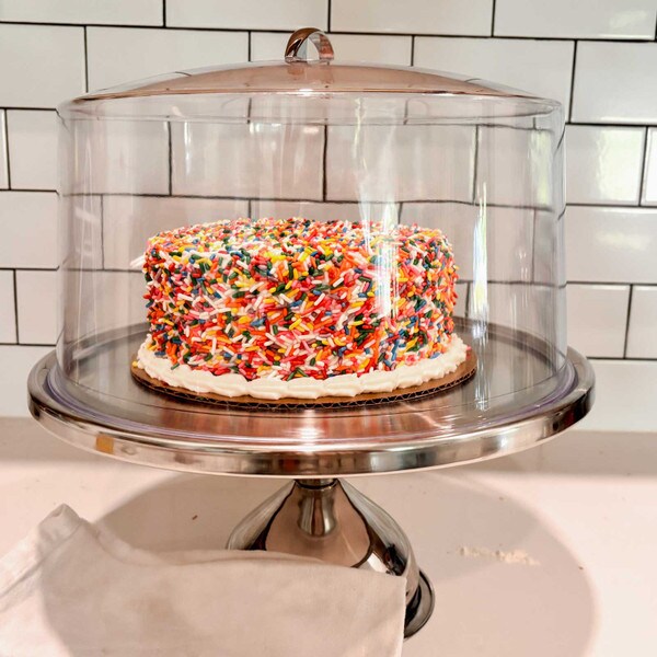 - Cover can fit over a cake with a maximum size of 10.5" dia x 5.75"
