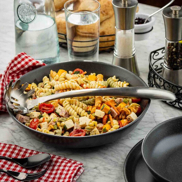 Elevate your pasta presentations with the Dalton Collection Pasta Grabber—designed for both function and style in high-volume service. The curved handle prevents the utensil from slipping into serving pans, while the brushed stainless steel finish adds a modern, upscale touch that’s easy to clean and maintain. The mirror-finish head is shaped for precision, making it easy to grip and serve spaghetti, linguine, penne, or any pasta variety with confidence. Ideal for buffet lines, catered events, and front-of-house service.
