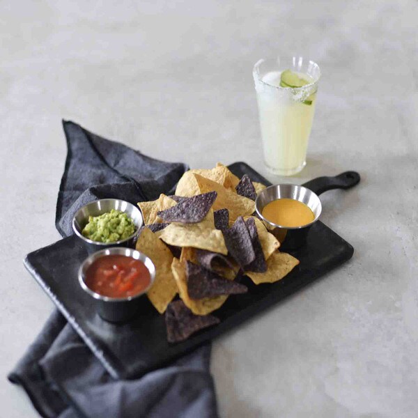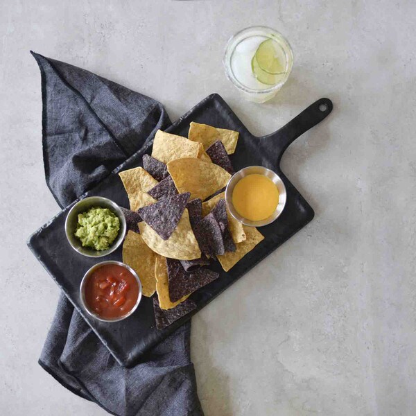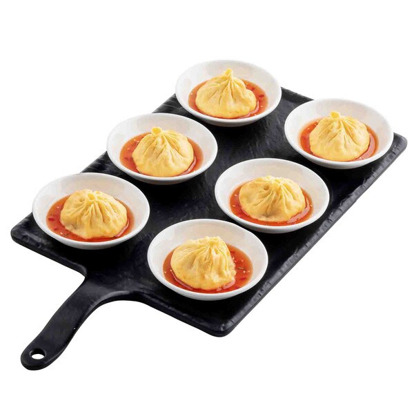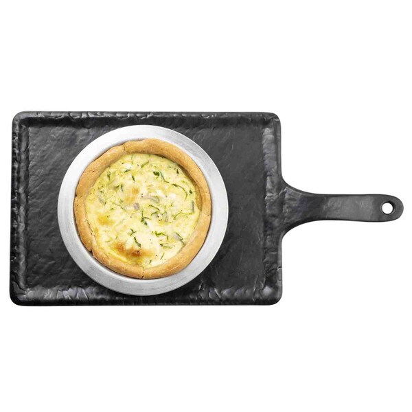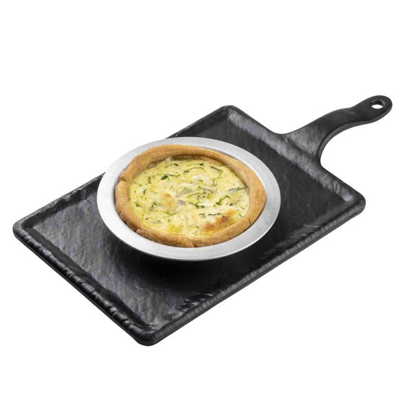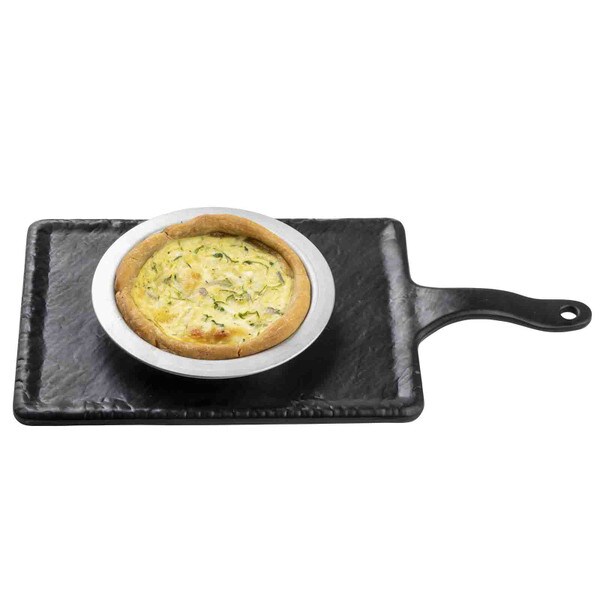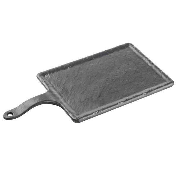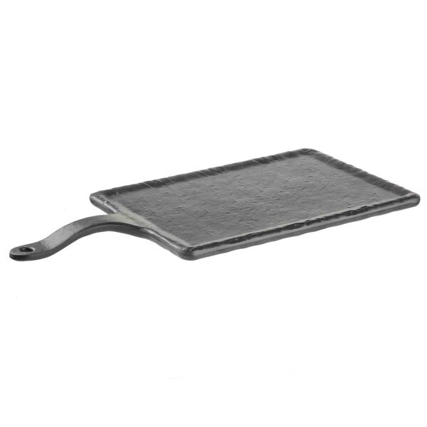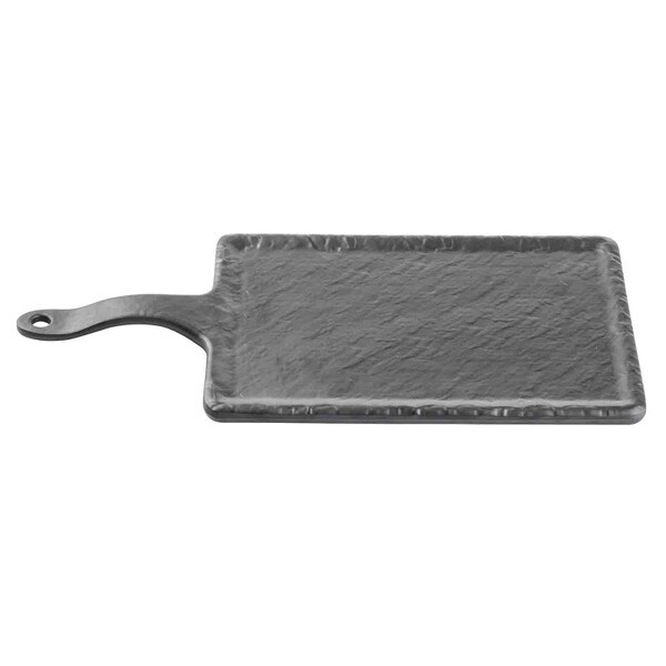 This small, black matte Frostone Slate tray is part of a charming collection that can be used to present a variety of cold dishes, appetizers or meat & cheese boards. The offset handle makes serving and table placement easier, whilst the raised lip helps keep food in place. Thanks to its melamine construction, it's durable and dishwasher safe. Ideal for caterers, buffet set-ups and commercial operations.