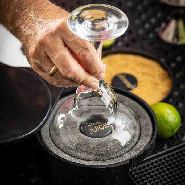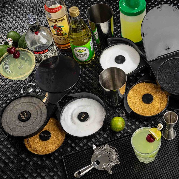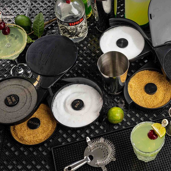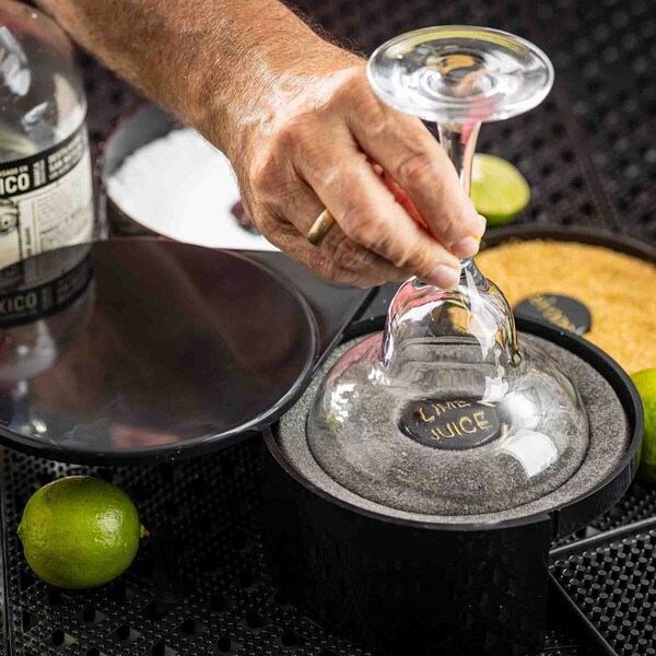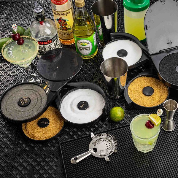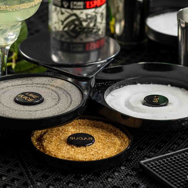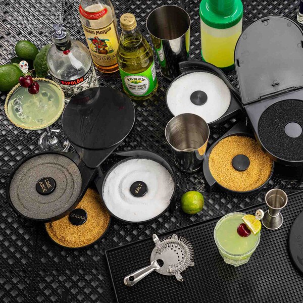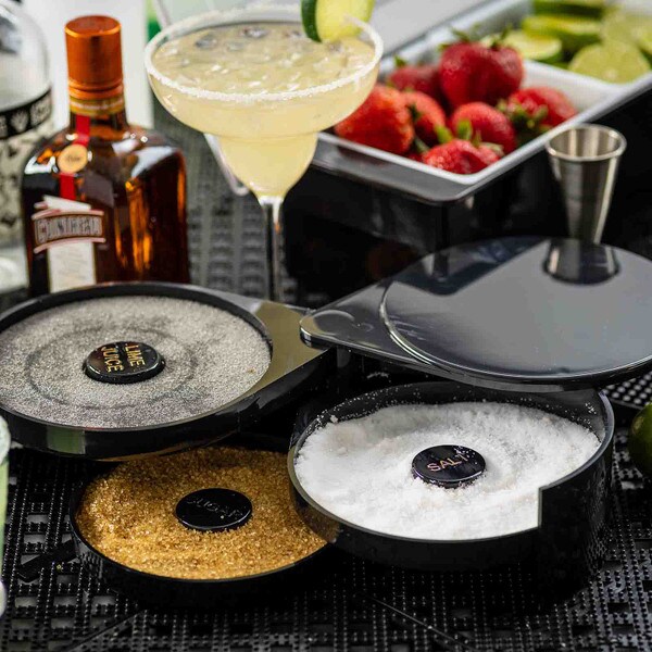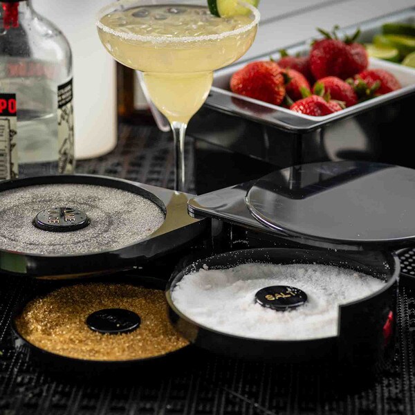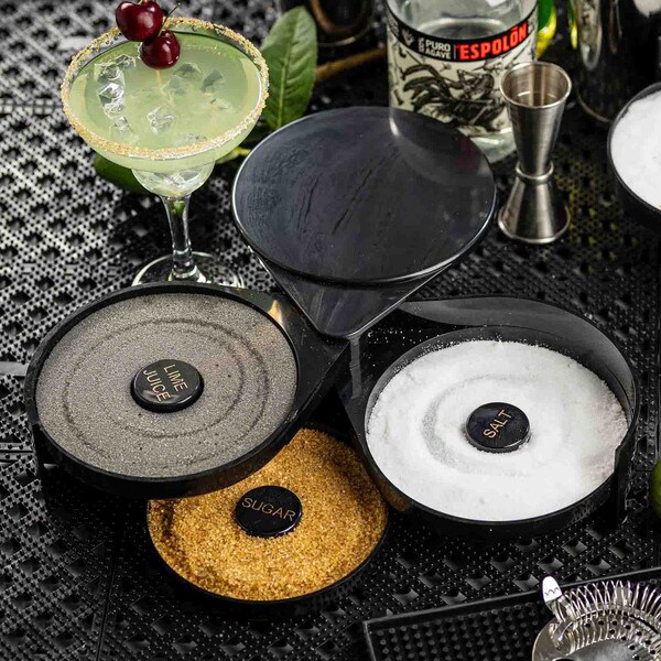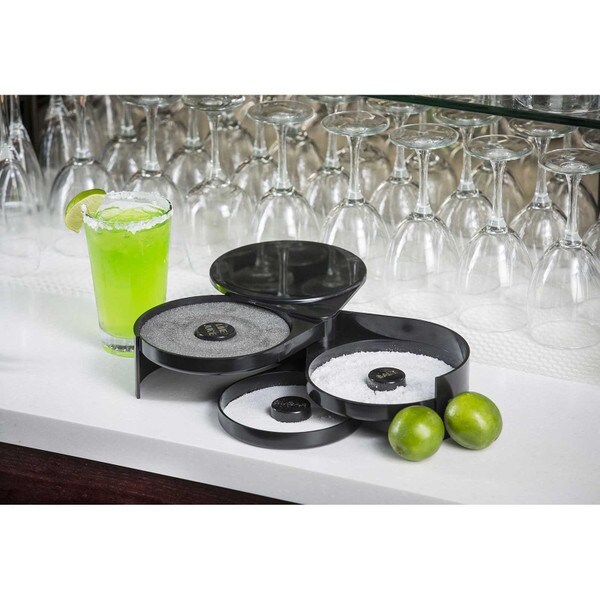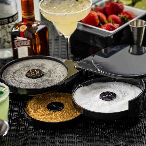 Set up the perfect margarita station with this cocktail glass rimmer. Featuring three swing out trays and one sponge tray to keep all the necessary ingredients for perfecting your margaritas in one convenient location. Each of the compartments is specially designed to hold salt, sugar, or spices. The juice container holds a durable sponge to hold your lime or lemon juice.