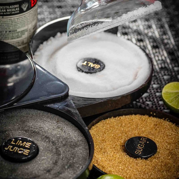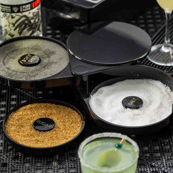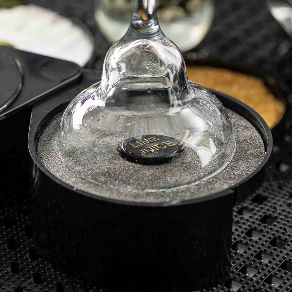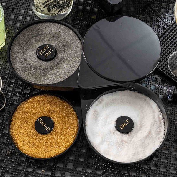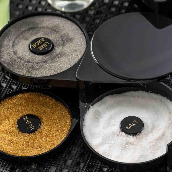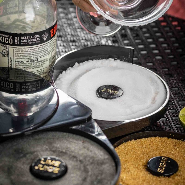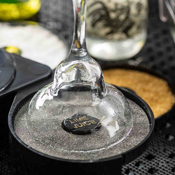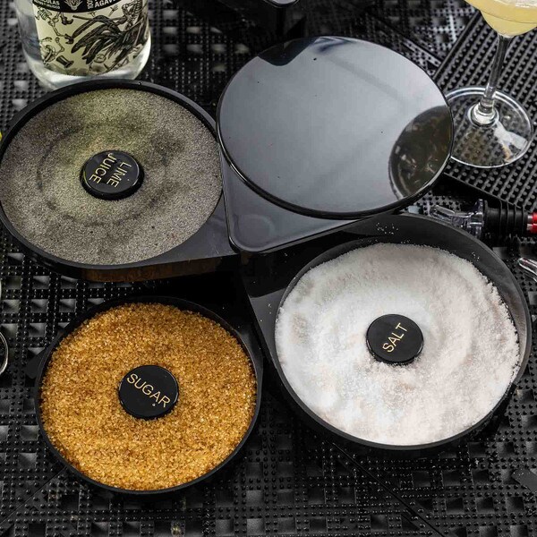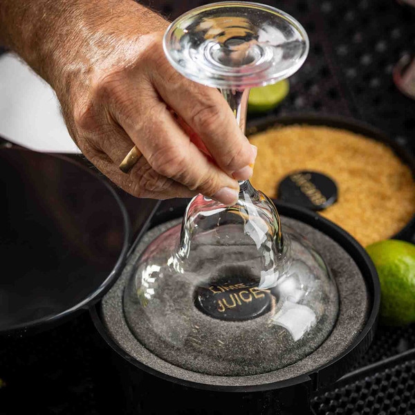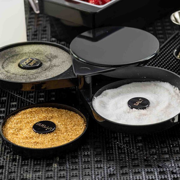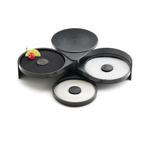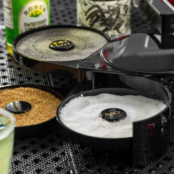 Set up the perfect margarita station with this cocktail glass rimmer. Featuring three swing out trays and one sponge tray to keep all the necessary ingredients for perfecting your margaritas in one convenient location. Each of the compartments is specially designed to hold salt, sugar, or spices. The juice container holds a durable sponge to hold your lime or lemon juice.