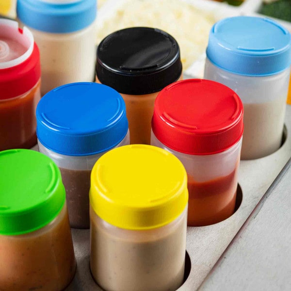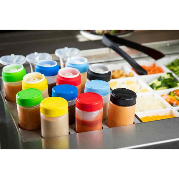 Upgrade your InvertaTop™ squeeze bottles with these 63mm colored end caps, designed to improve efficiency and organization in fast-paced kitchens and bars. Each assorted pack of 6 includes 2 each of yellow, blue, red, black, light blue, and light green, making it easy to color-code bottles for sauces, dressings, condiments, or specialty mixes. The threaded design ensures a quick on/off fit while keeping caps securely in place, even in high-volume environments. Each cap also features a built-in ring base, allowing the bottle to stand upright when inverted -- reducing waste and keeping prep lines clean and efficient. A must-have accessory for restaurants, catering operations, and bar service.