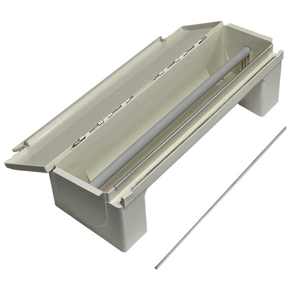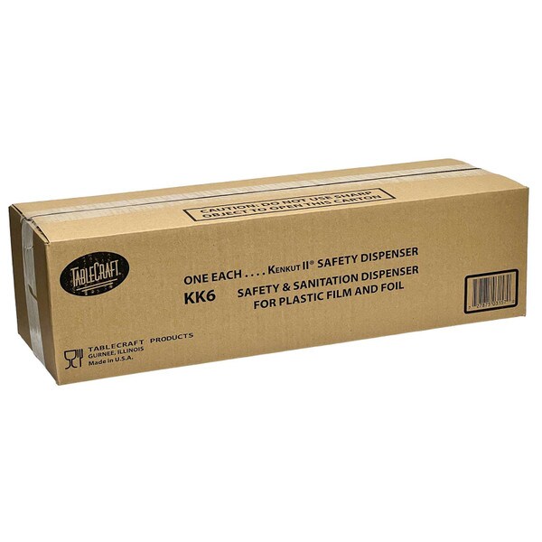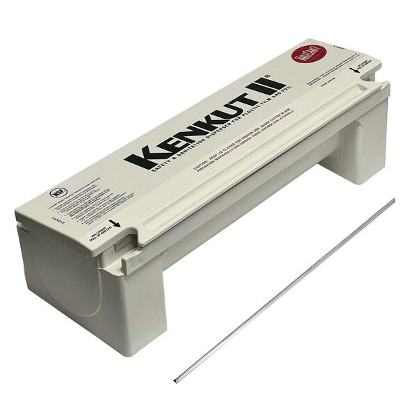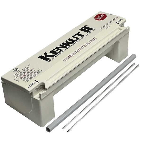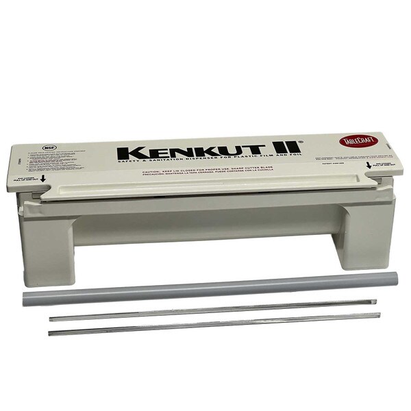 Perfect for dispensing film and foil, our KenKut II holds 24" rolls up to 6" diameter (3,000 ft. rolls). Featuring an anti-static bar and metal safety blade, it is a hygienic solution that complies to HACCP and food code standards. Strong and durable kitchen essential, our dispenser features integrated handles, wall-mounting option and suction-cup feet. Safety blade removes for loading & clean-up.