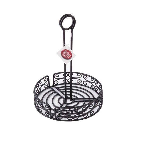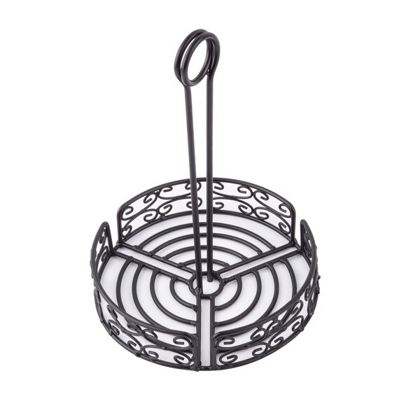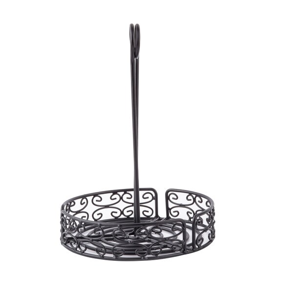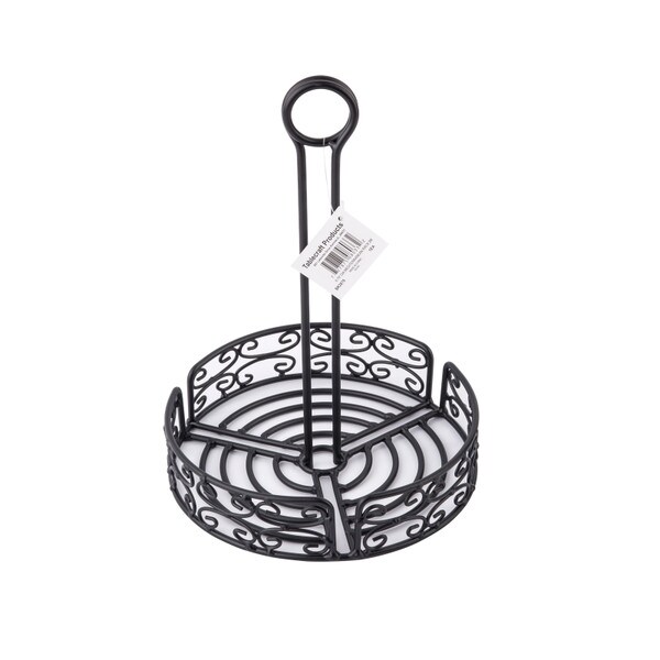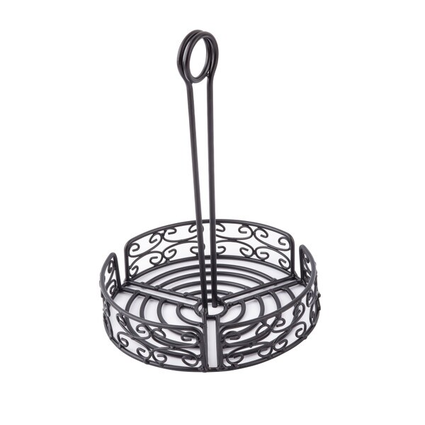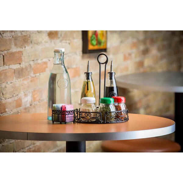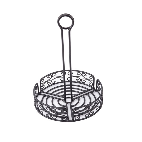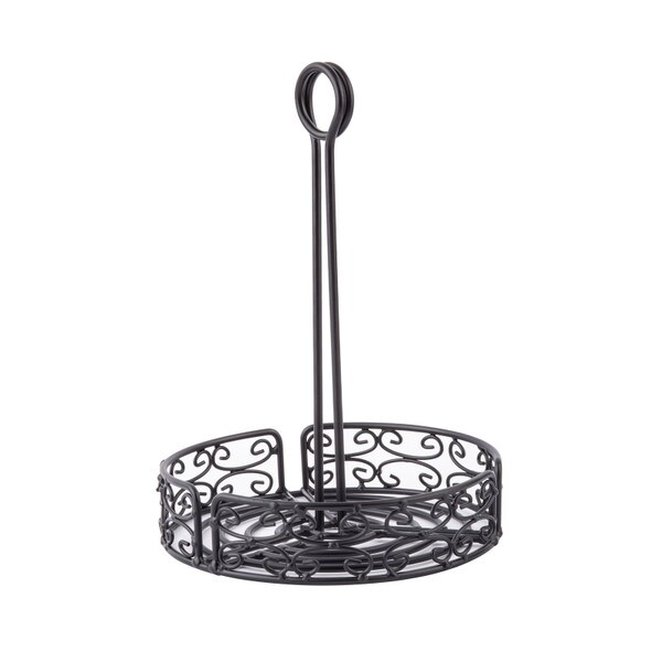 Ciao! Bring the feeling of dining alfresco in Rome to your tabletop anywhere in the world with our Versa Rack™ condiment racks, offering functionality and style to your tabletop. Our Mediterranean Collection Round Rack includes a top loop to display menus, specials and promotional material, and acts as a handle for easy transportation. The flat-bottom basket secures condiments and seasoning with ease, maximizing table space.