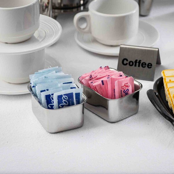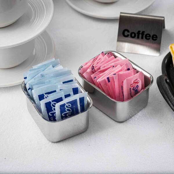 Serve pre-portioned sugar and sweetener packets/tubes on tables, counters or buffet lines with this sleek packet holder. Made of Stainless Steel, this shiny rectangular holder features a rolled lip for a modern industrial style that will compliment any setting. Use with sweeteners, tea sachets and more.