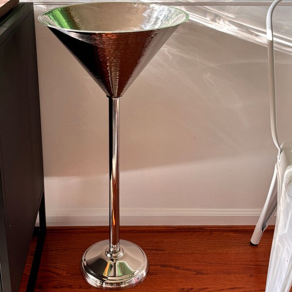 Turn heads with this giant 4½ qt Martini Glass Beverage Stand in a rice pattern with a mirror finish that stands at an impressive 32.5" tall. Fill with ice and beverages of choice for an impressive chilled server at any event. It's a unique show-stopper!