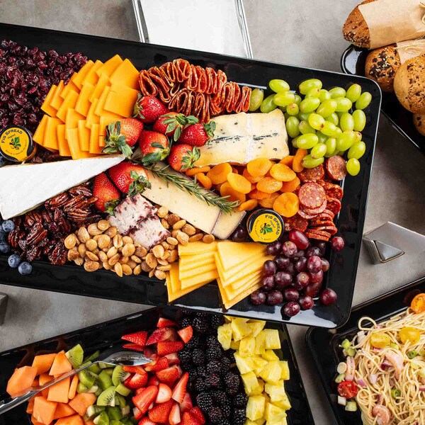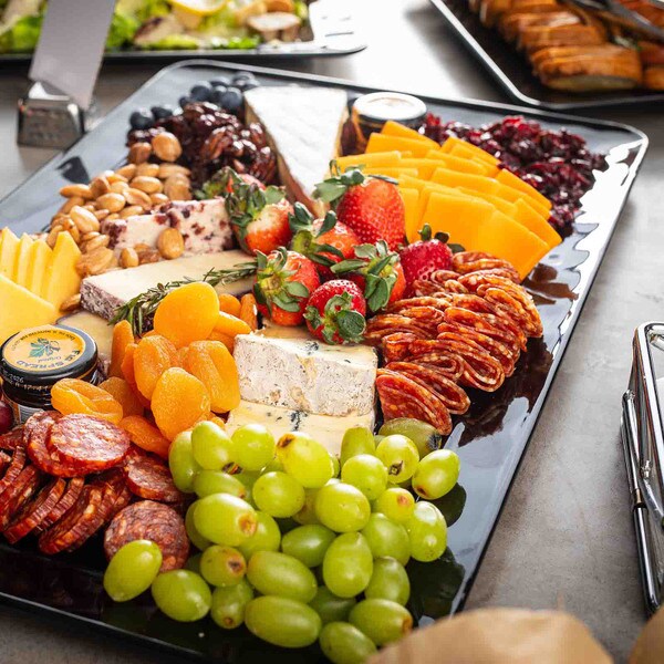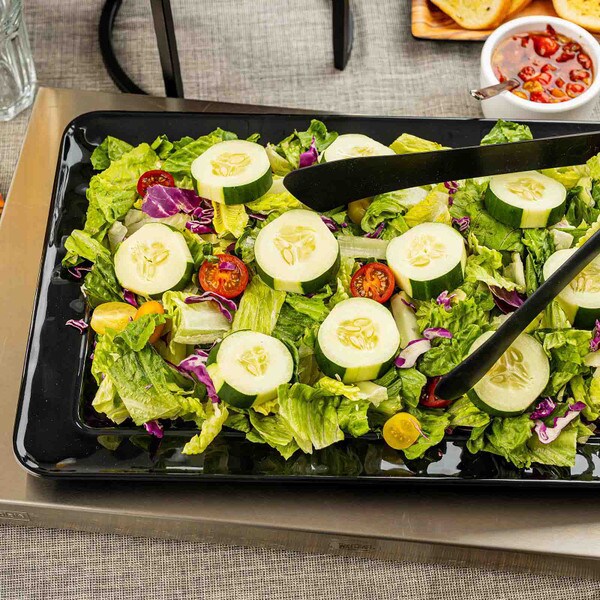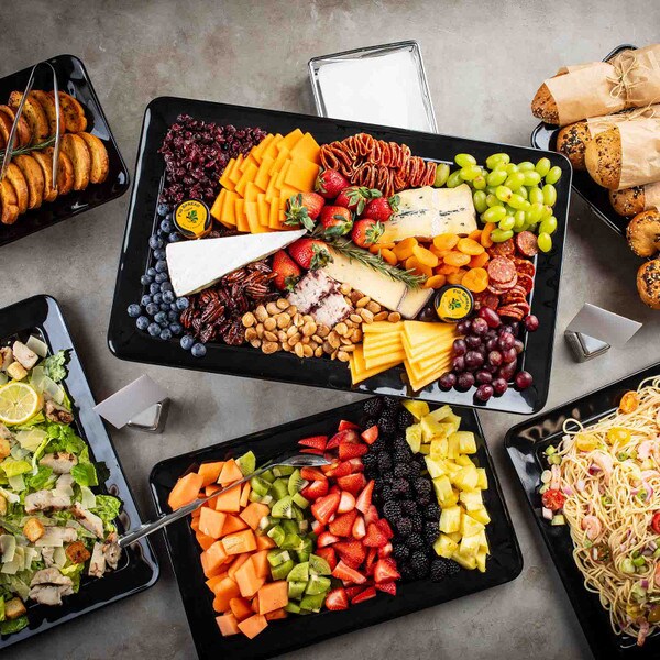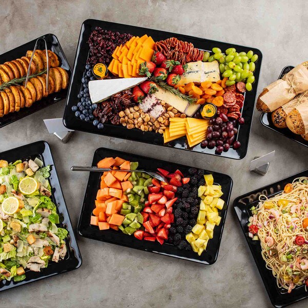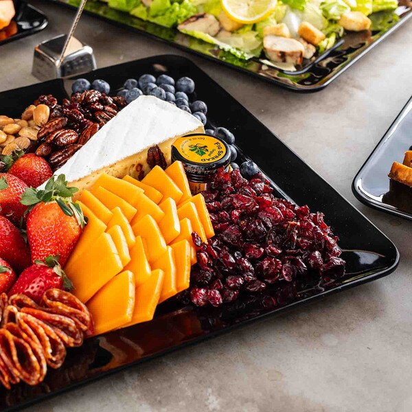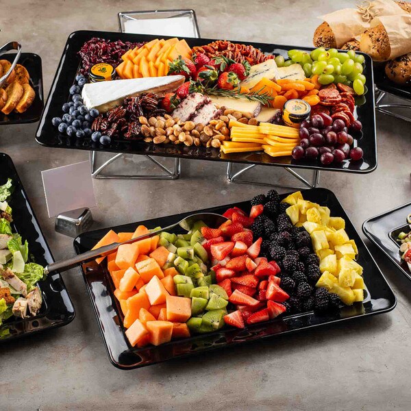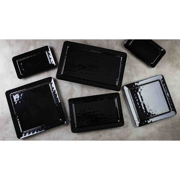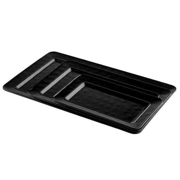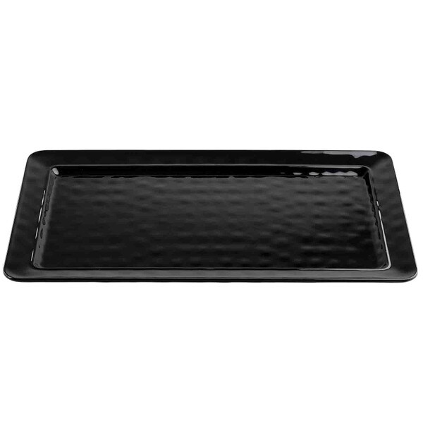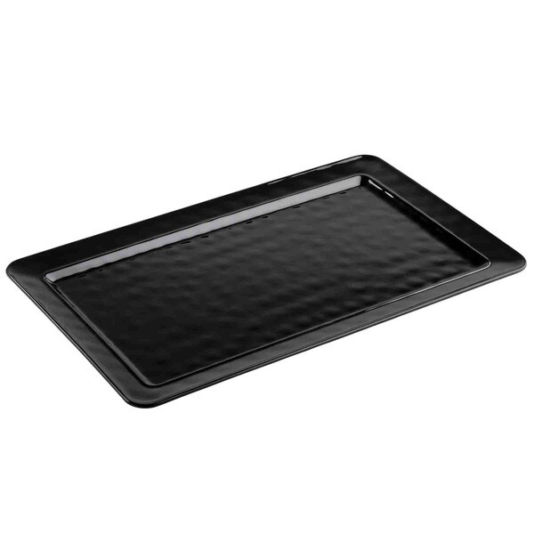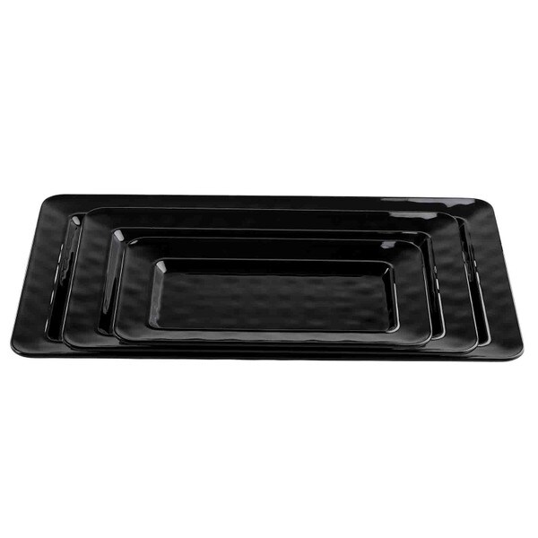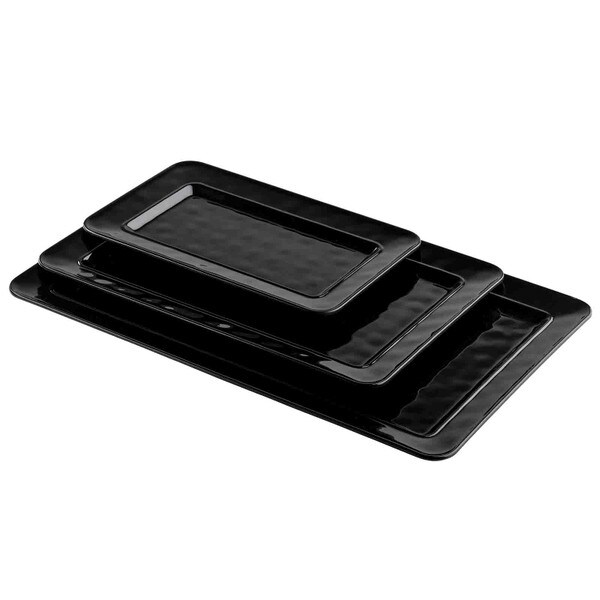 Whether it's for a special occasion or enhancing your buffet serving line, these Ridge Collection™ platters resemble natural ceramic pieces with a high-gloss textured finish, but with the durability of melamine. This black rectangular platter can double as an entree dish, or serve passed appetizers, present delicious desserts and more.