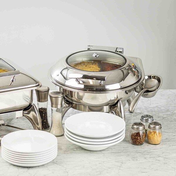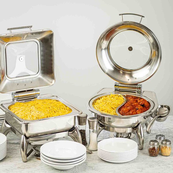 Our highly-polished stainless steel Quick View Chafers will elevate any catering or buffet line. Windows allow guests to see contents prior to opening the chafer. Steam vents reduce condensation. Slow closing lids reduce the noise that often comes with opening and closing during service. Lids also include safety features for operators to remove and replace food pan inserts easily and safely without risk of steam burns.