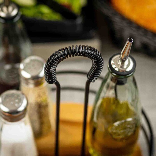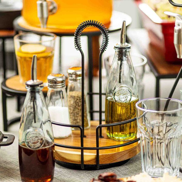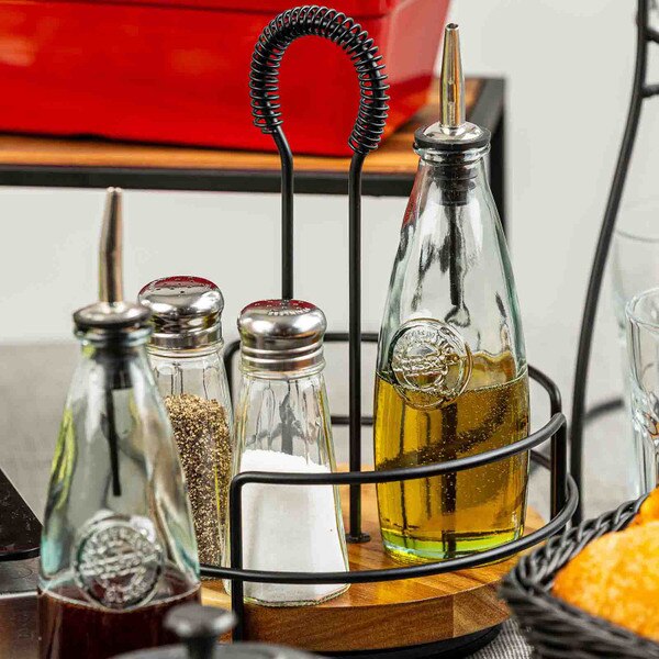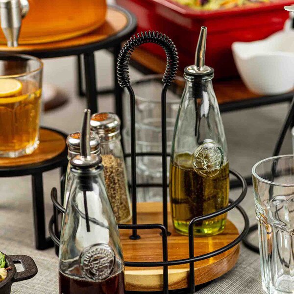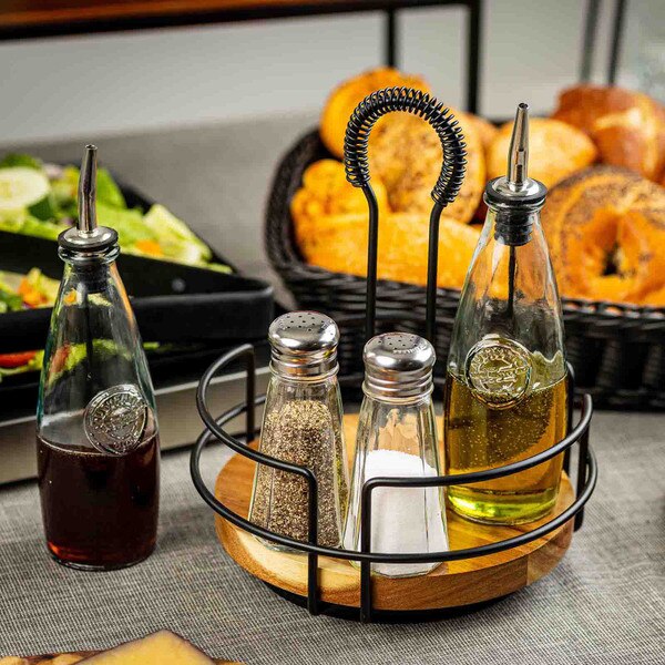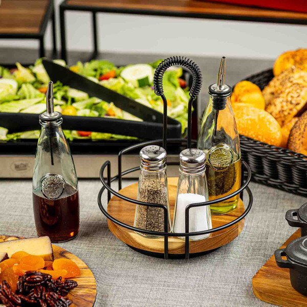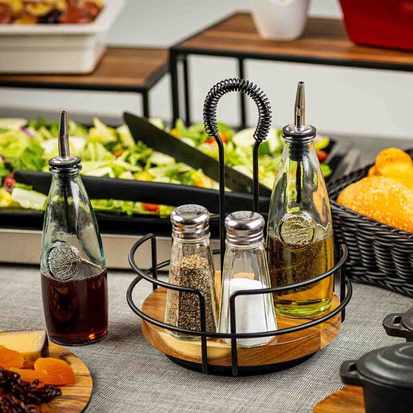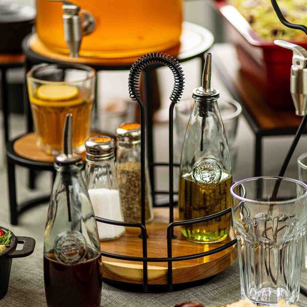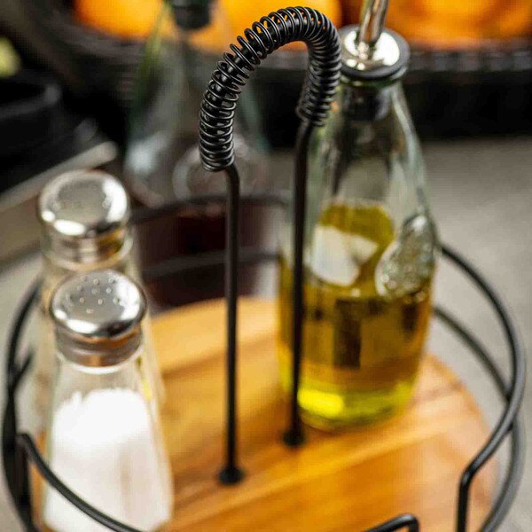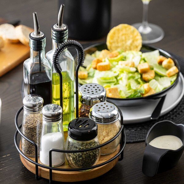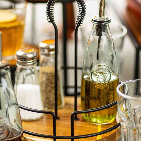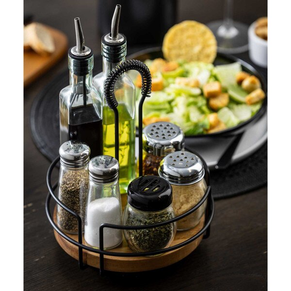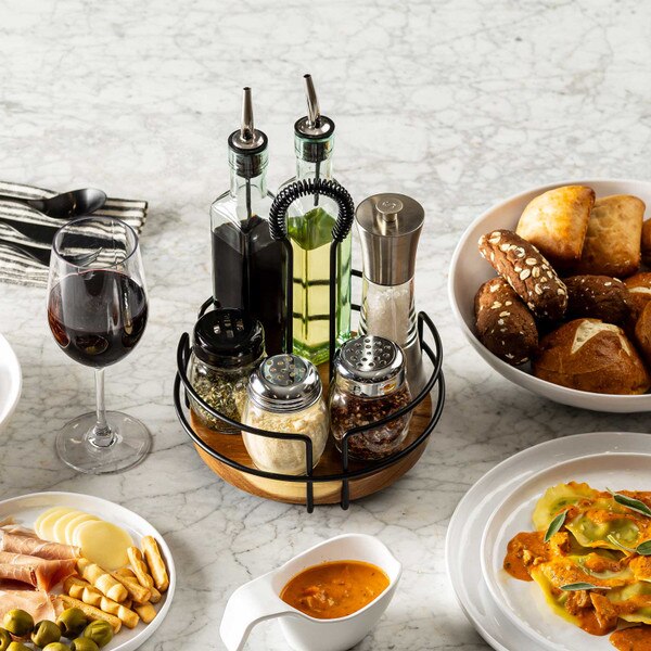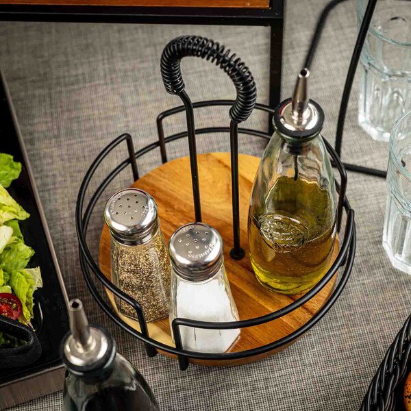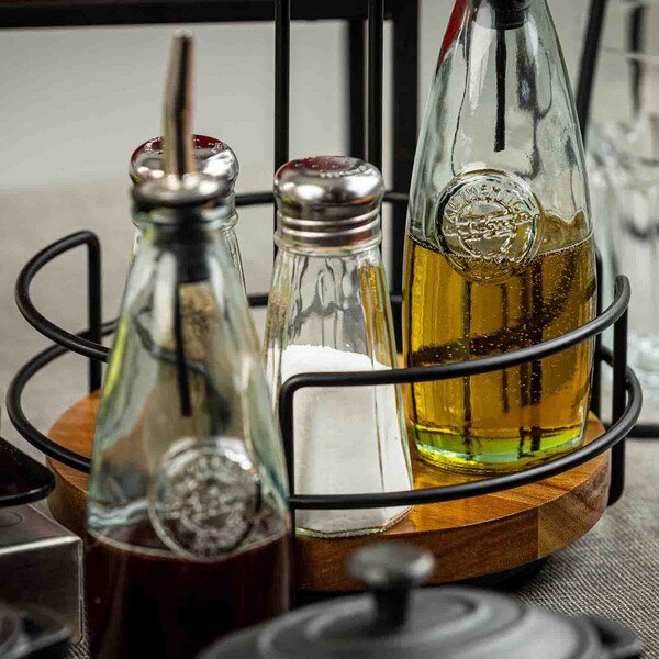 Elevate your tabletop with this stylish, rotating caddy crafted from Acacia Wood with a black powder coated handle. Designed for modern convenience, it allows easy access to all condiments from the center of the table, making it both functional and elegant. This caddy enhances your dining experience by ensuring everything you need is within effortless reach.