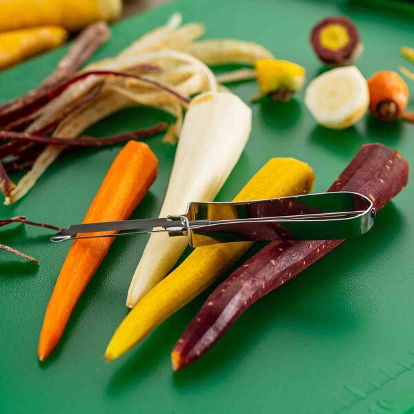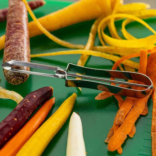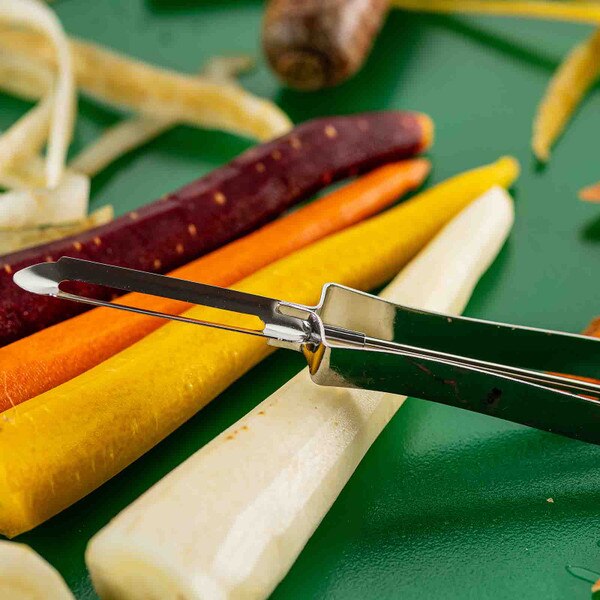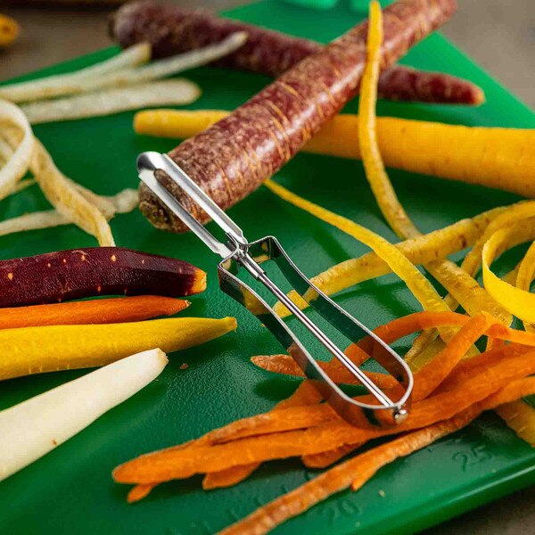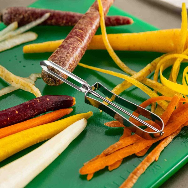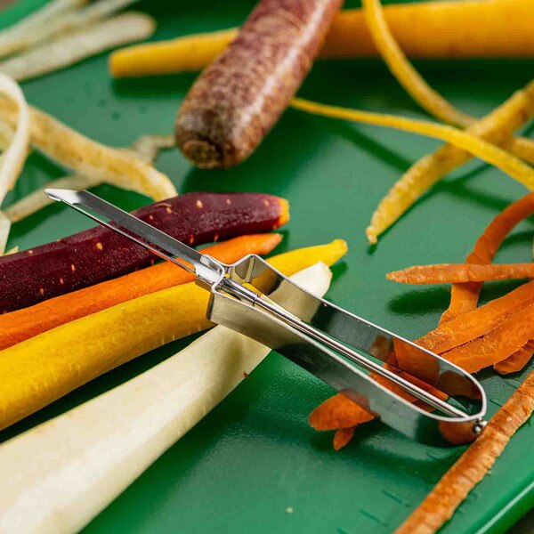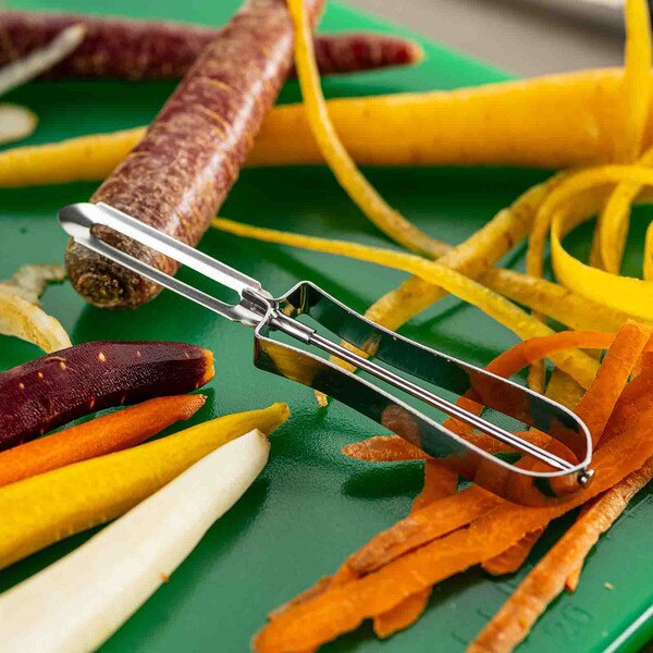 Easily peel and prep vegetables in your kitchen with this 6" swivel vegetable peeler with a stainless steel blade. This tool is built to offer long-lasting durability and you can create fruit garnishes or quickly peel potatoes, carrots, and cucumbers in time for dinner service.