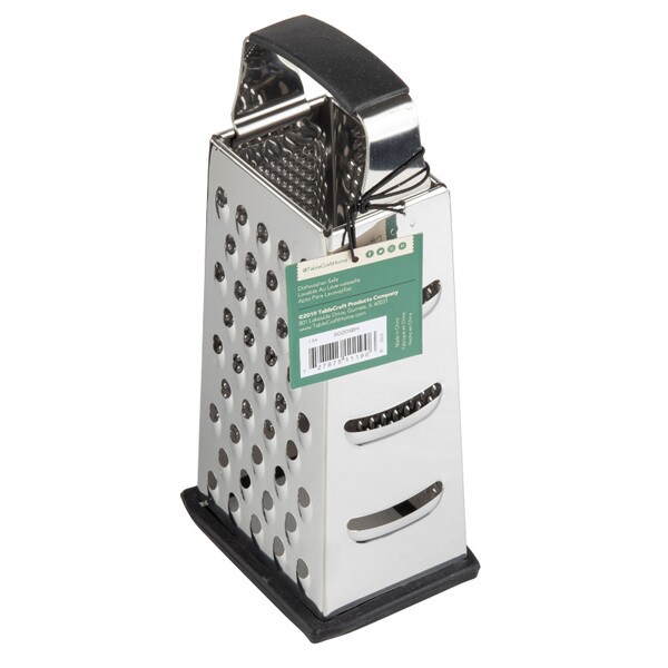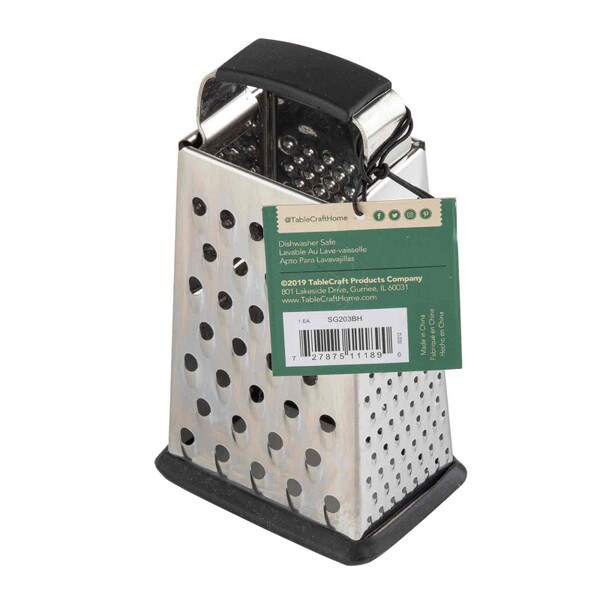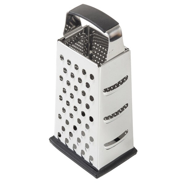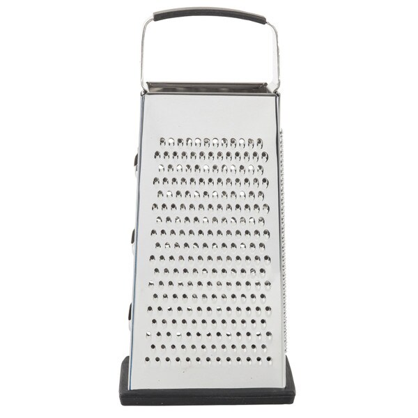Tackle a variety of prep tasks with our compact 4-sided tapered grater, designed for versatility and efficiency in professional kitchens. Each side offers a different function -- fine grating, coarse grating, zesting, and slicing -- making it the perfect all-in-one tool for cheese, vegetables, citrus, and more. A sturdy top handle provides a secure grip for stability during use, while the durable stainless steel construction withstands heavy-duty, daily foodservice demands and the rubber bottom keeps it in place. Compact and efficient, this grater is an essential tool for restaurants, catering, and high-volume kitchens.