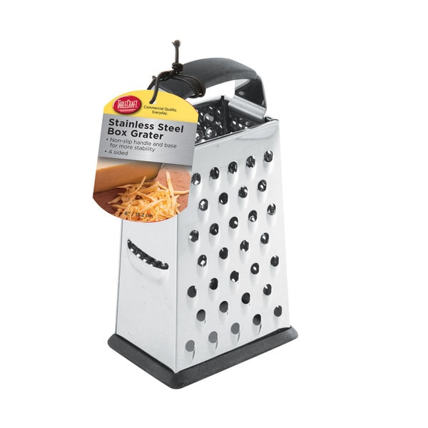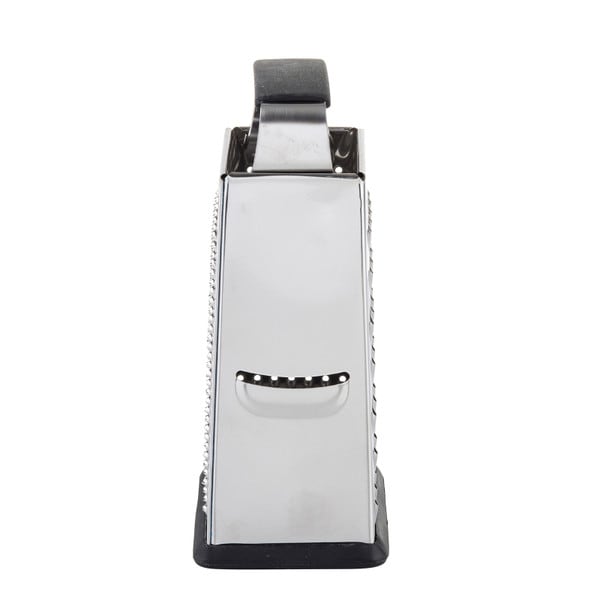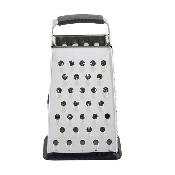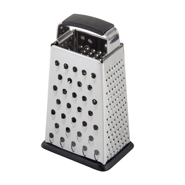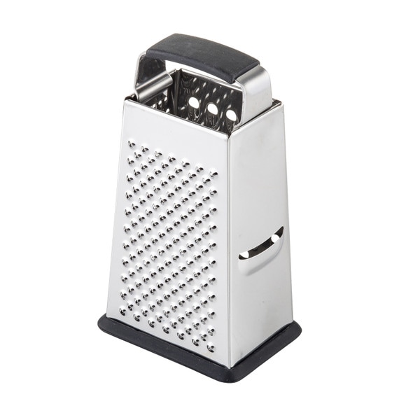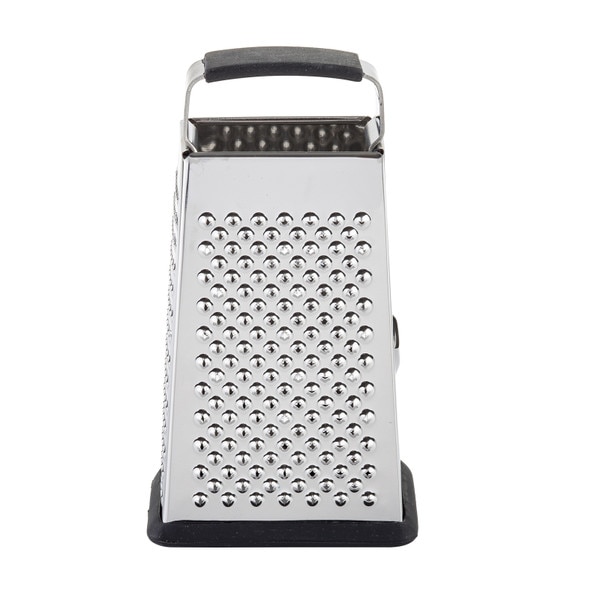 Tackle a variety of prep tasks with our compact 4-sided tapered grater, designed for versatility and efficiency in professional kitchens. Each side offers a different function -- fine grating, medium grating, zesting, and slicing -- making it the perfect all-in-one tool for cheese, vegetables, citrus, and more. A sturdy top handle provides a secure grip for stability during use, while the durable stainless steel construction withstands heavy-duty, daily foodservice demands and the rubber bottom keeps it in place. Compact and efficient, this grater is an essential tool for restaurants, catering, and high-volume kitchens.