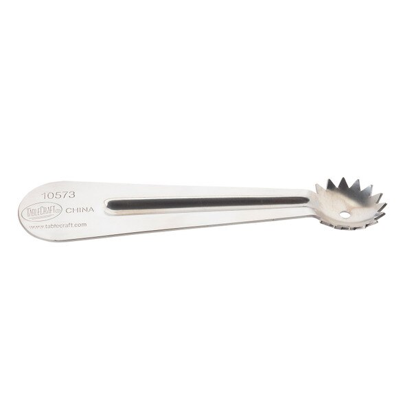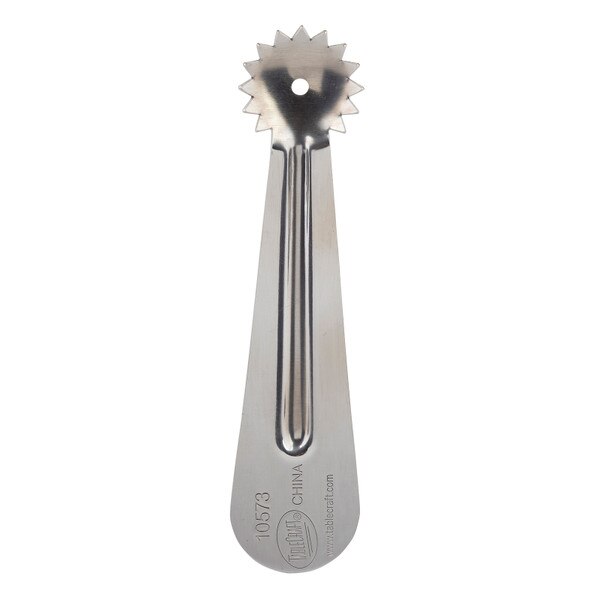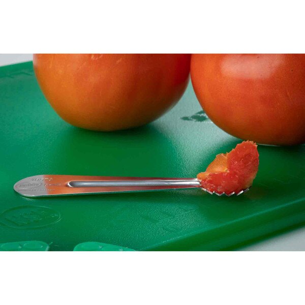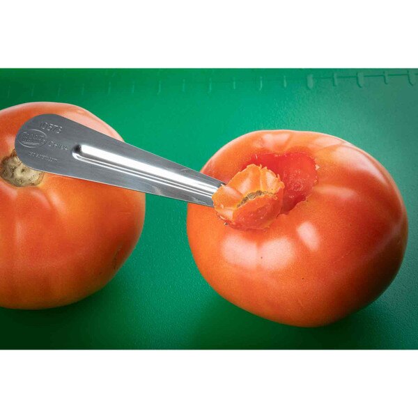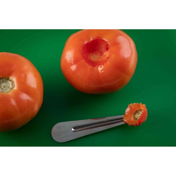 Remove the stems from your fresh, juicy tomatoes without fear of bruising by using this tomato stem corer! This convenient tool, also known as a tomato shark, comes equipped with sharp teeth that quickly remove the stem from any ripe or unripe tomato, or even cucumbers and potatoes. It can also be used to craft wavy melon balls for added versatility. Pack of 12.