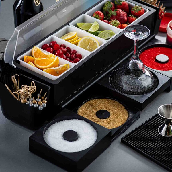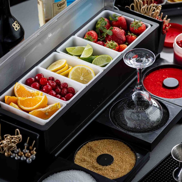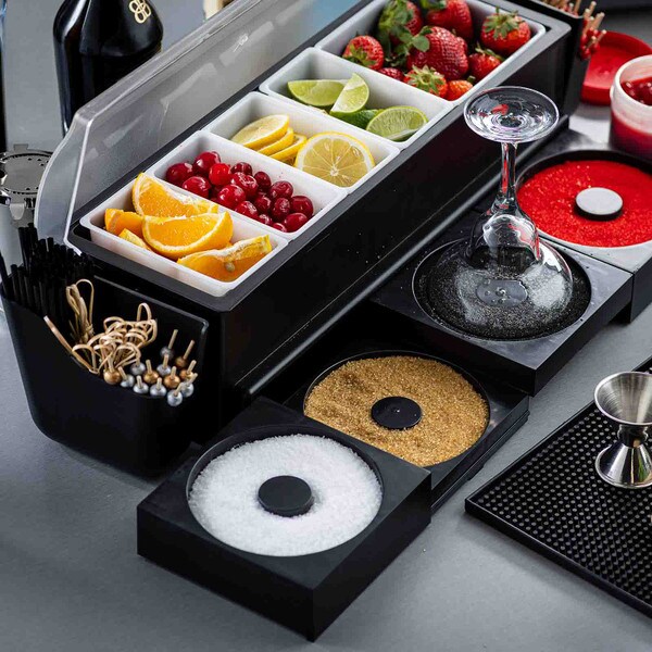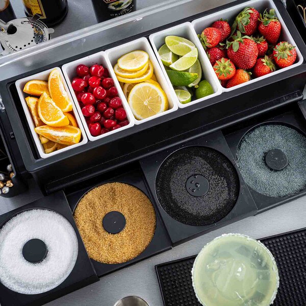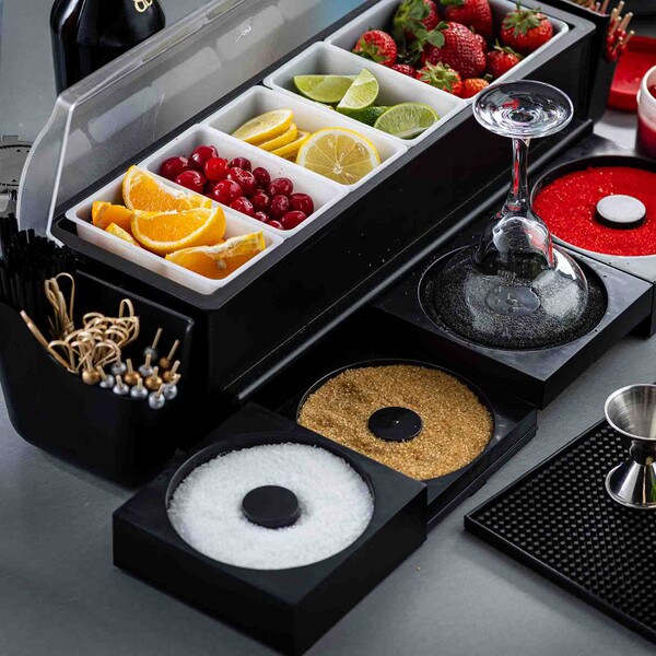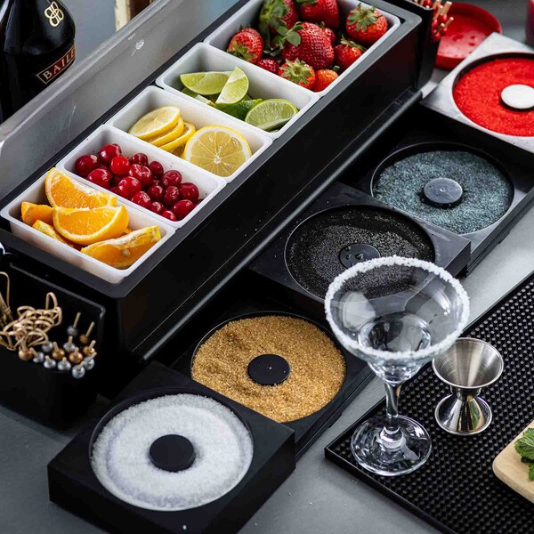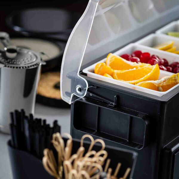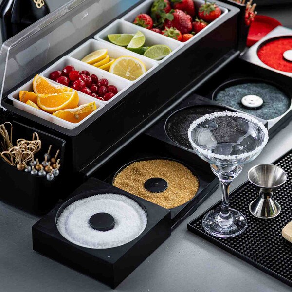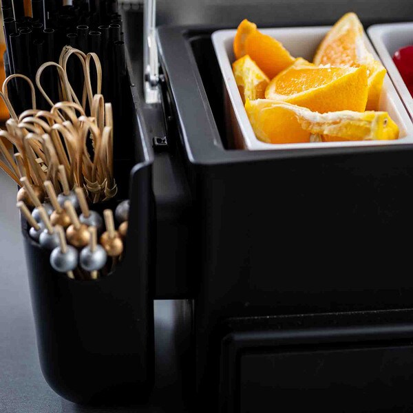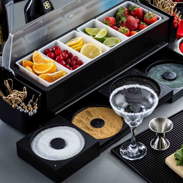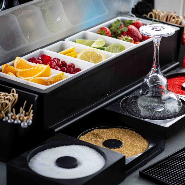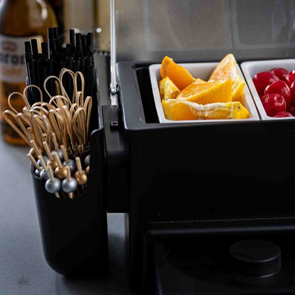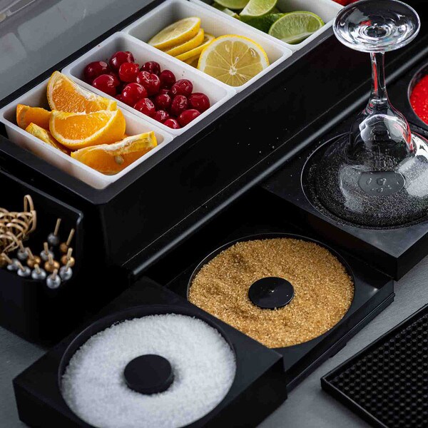 Not only are garnished beverages and rimmed glasses fun, but now they're easier than ever to prepare with the Ultimate Garnish Station™! This station features (1) 1 quart and (4) 1 pint removable bins for storing lemons, olives, cherries, and other condiments, which can all be covered with a flip-down lid. On either side of the station is a 2 compartment caddy, providing a total of 4 compartments for cocktail picks, stirrers, and umbrellas.