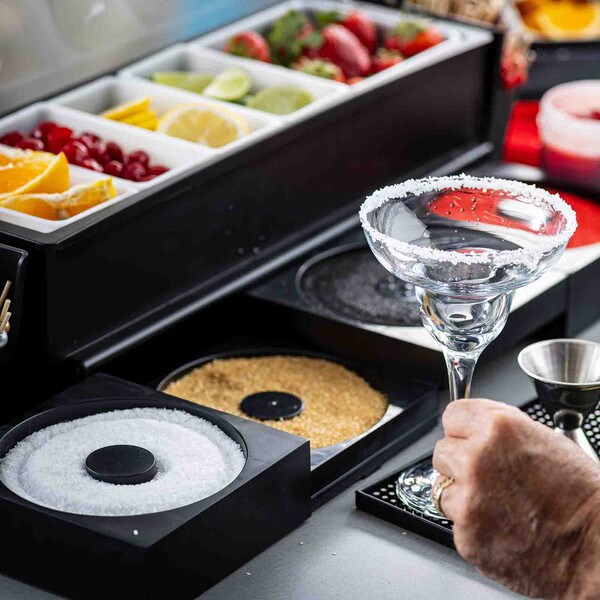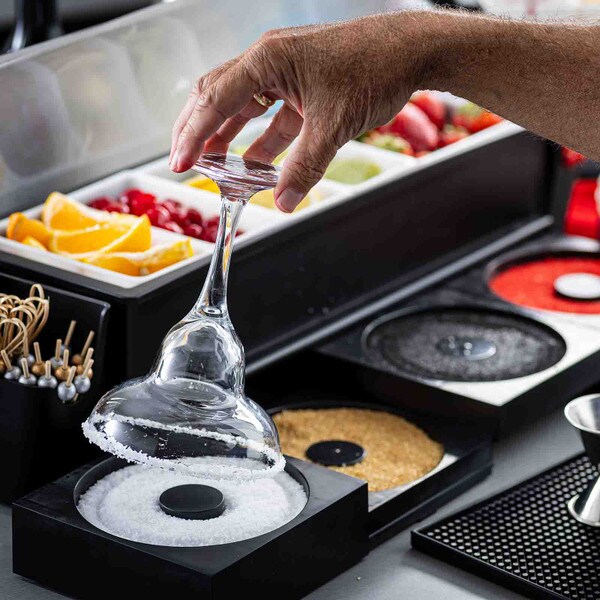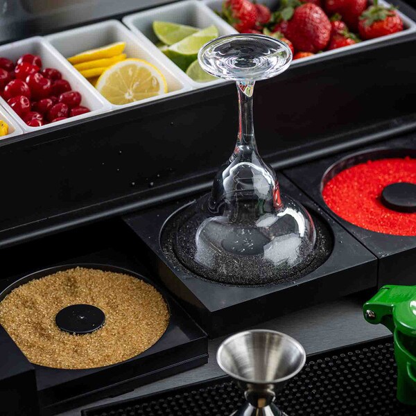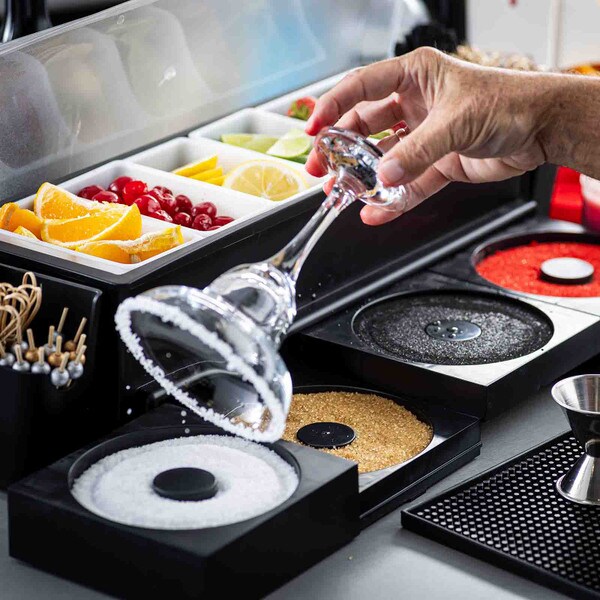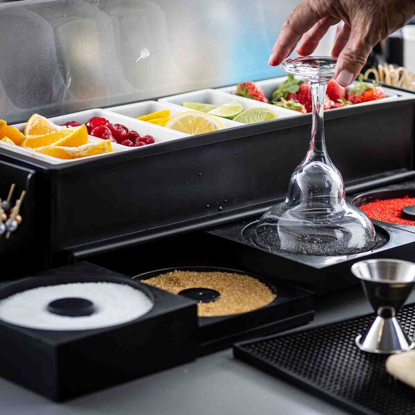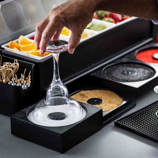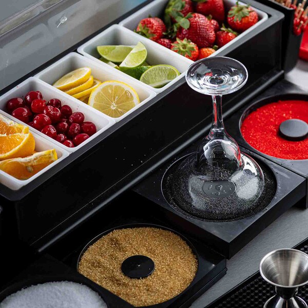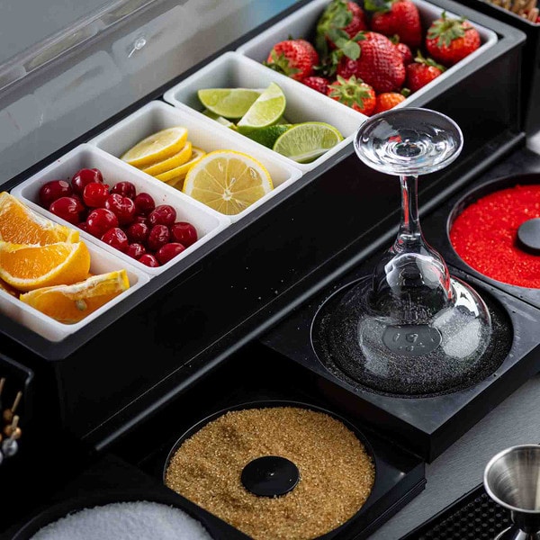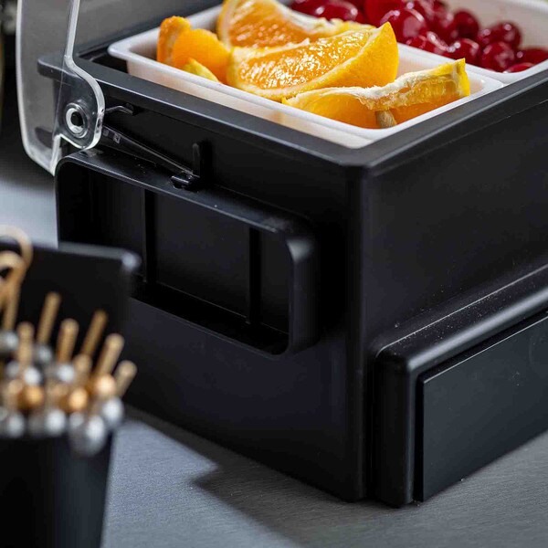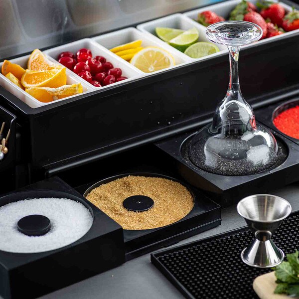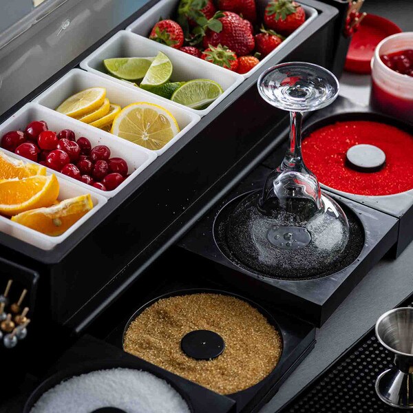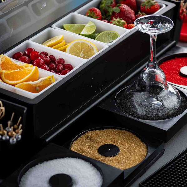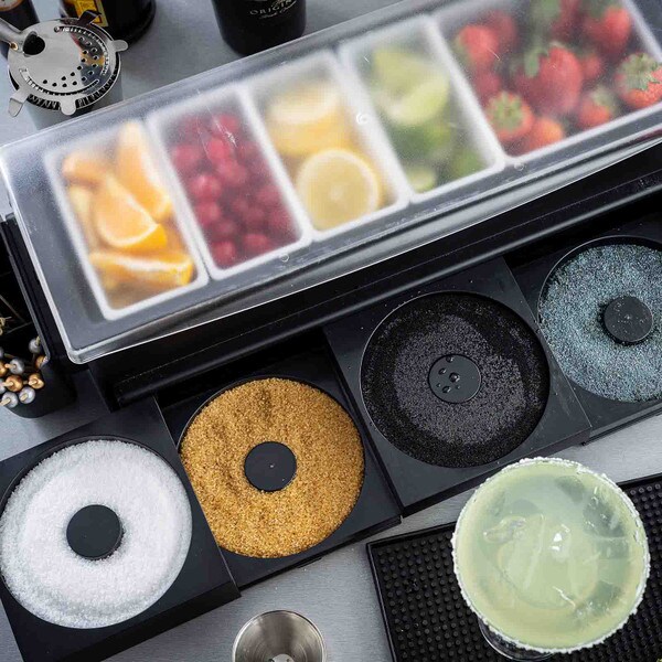 Not only are garnished beverages and rimmed glasses fun, but now they're easier than ever to prepare with the Ultimate Garnish Station™! This station features (1) 1 quart and (4) 1 pint removable bins for storing lemons, olives, cherries, and other condiments, which can all be covered with a flip-down lid. On either side of the station is a 2 compartment caddy, providing a total of 4 compartments for cocktail picks, stirrers, and umbrellas.